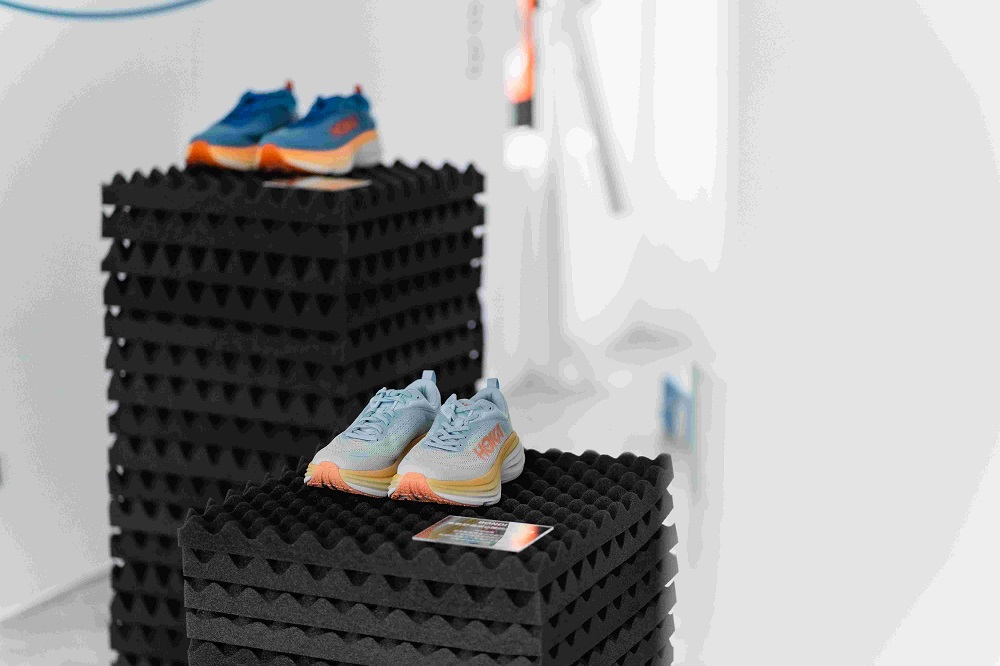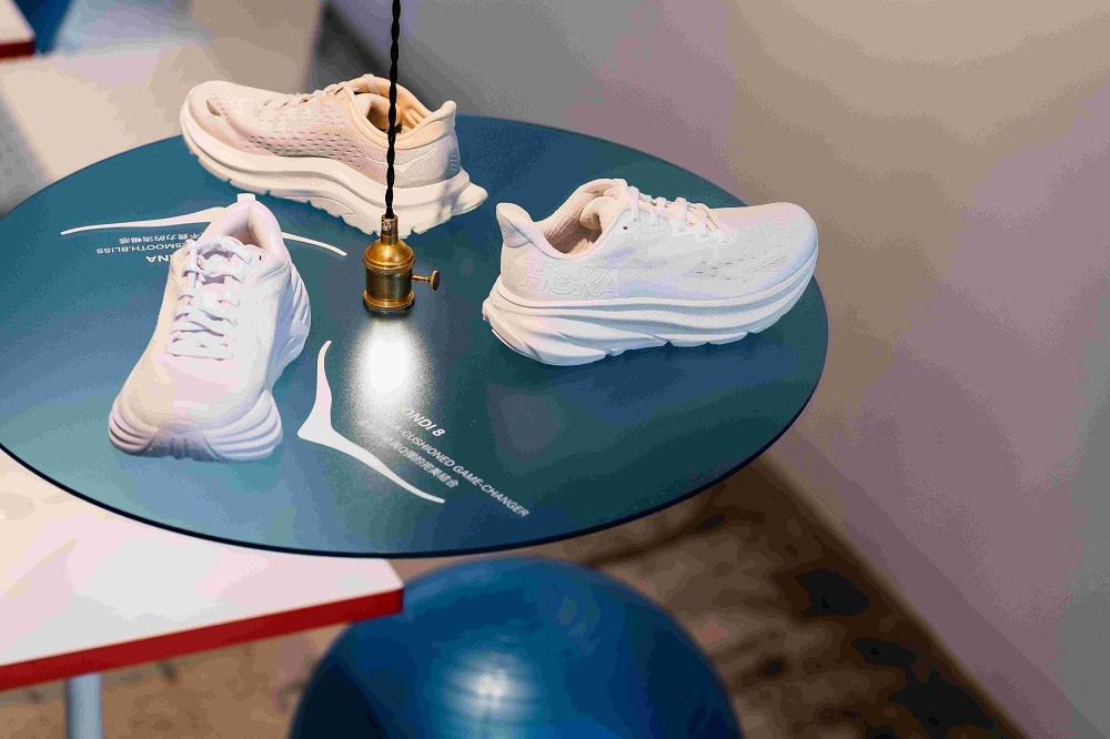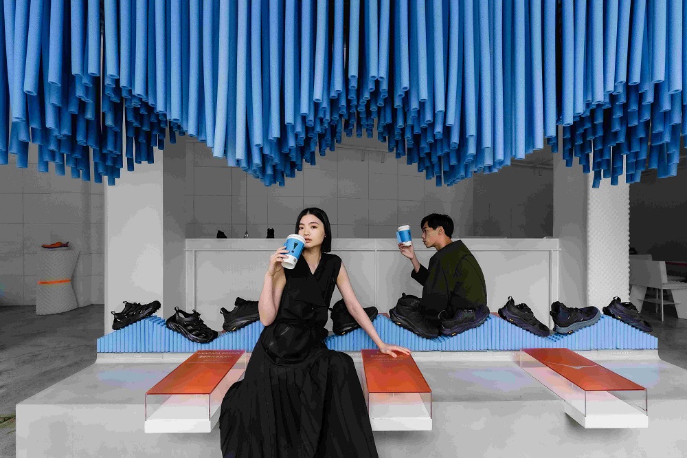 「BOUNC!NG ZONE」共分為兩大體驗區,一進入 CAFE!N 民權門市,即可在 1F 的天井區中與不倒翁式充氣柱緊密相連,具象化的感受 HOKA 鞋底回彈時的緩震作用,上到 2F,多元樣式的Q彈媒材接力登場,HOKA 雙系列鞋款也在此區域展示,其中 GLIIDE 系列的跑鞋 Bondi 8、Clifton 9 與 Kawana 三款時下最受戶外與潮流風格熱愛的穿搭鞋款,透過巧妙的垂吊燈飾進入客席區中,讓品味咖啡的過程,可以近距觀看 HOKA 跑鞋的設計細節;通往戶外探險大門的 SKY HIKE 系列登山鞋款 Kaha 2、Anacapa 與 Hopara 陳列於中島座位,並運用緩震泡棉構建呈現上下陡坡,鞋款採用黃金大底展現全方位緩震支撐,讓戶外生活、都市探險都更加穩定舒適。