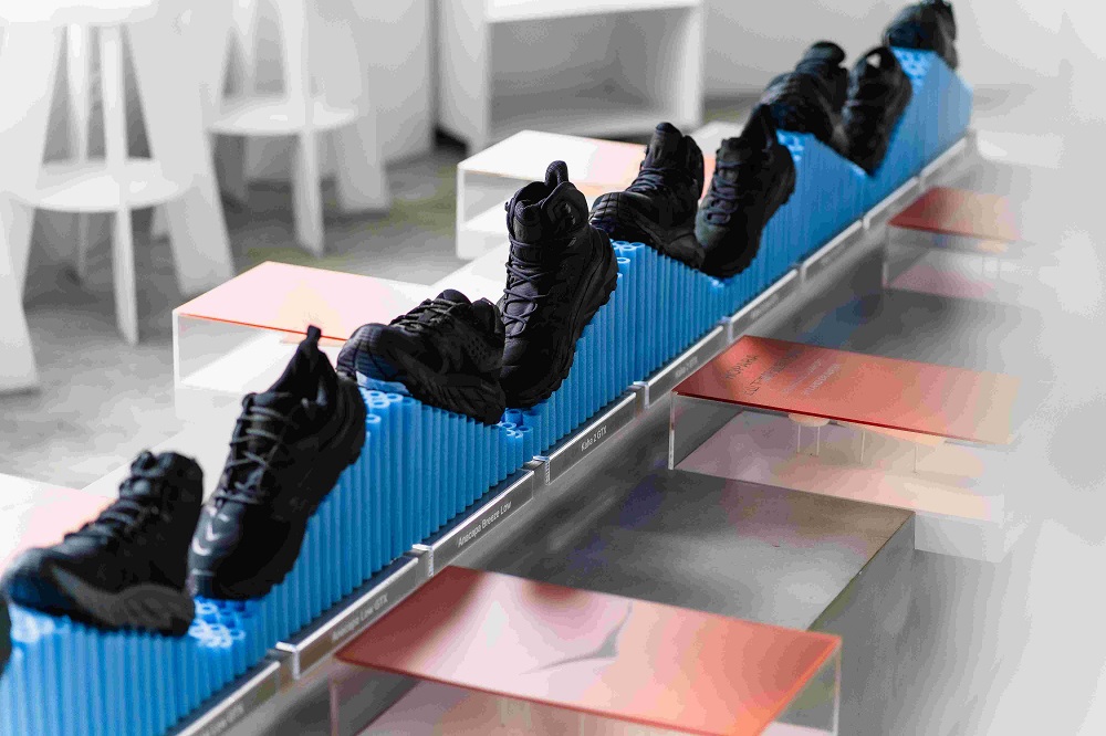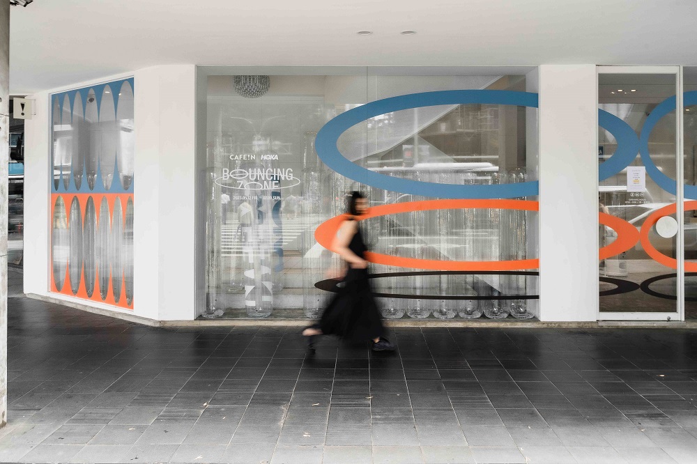 在此次的「BOUNC!NG ZONE」概念店中,除了 HOKA 經典的 「SKY HIKE」 山系鞋款與 「GLIDE」 跑鞋鞋款展示之外,亦以策展思維貫穿於視覺與空間,企圖模糊展示與餐飲空間的界線,同時也將 HOKA 鞋底回彈的感受透過視覺具象化、將 BOUNCING 的體感體驗植入於咖啡空間。
