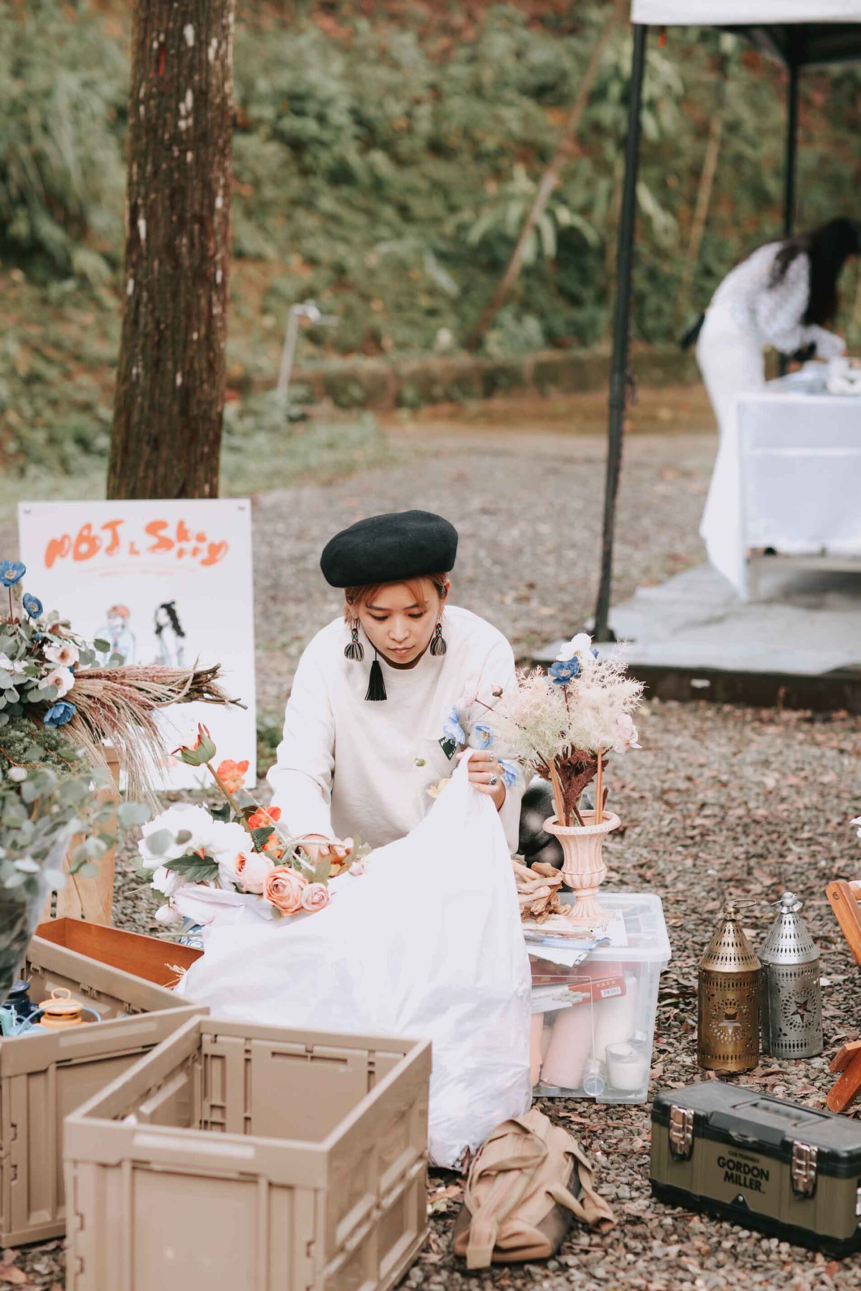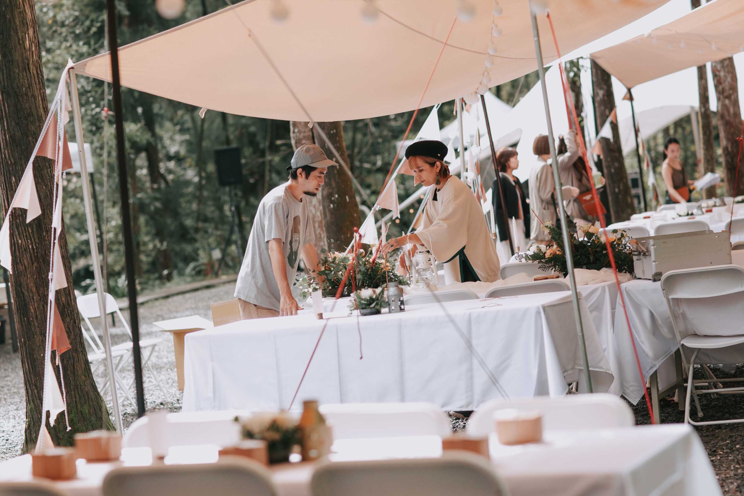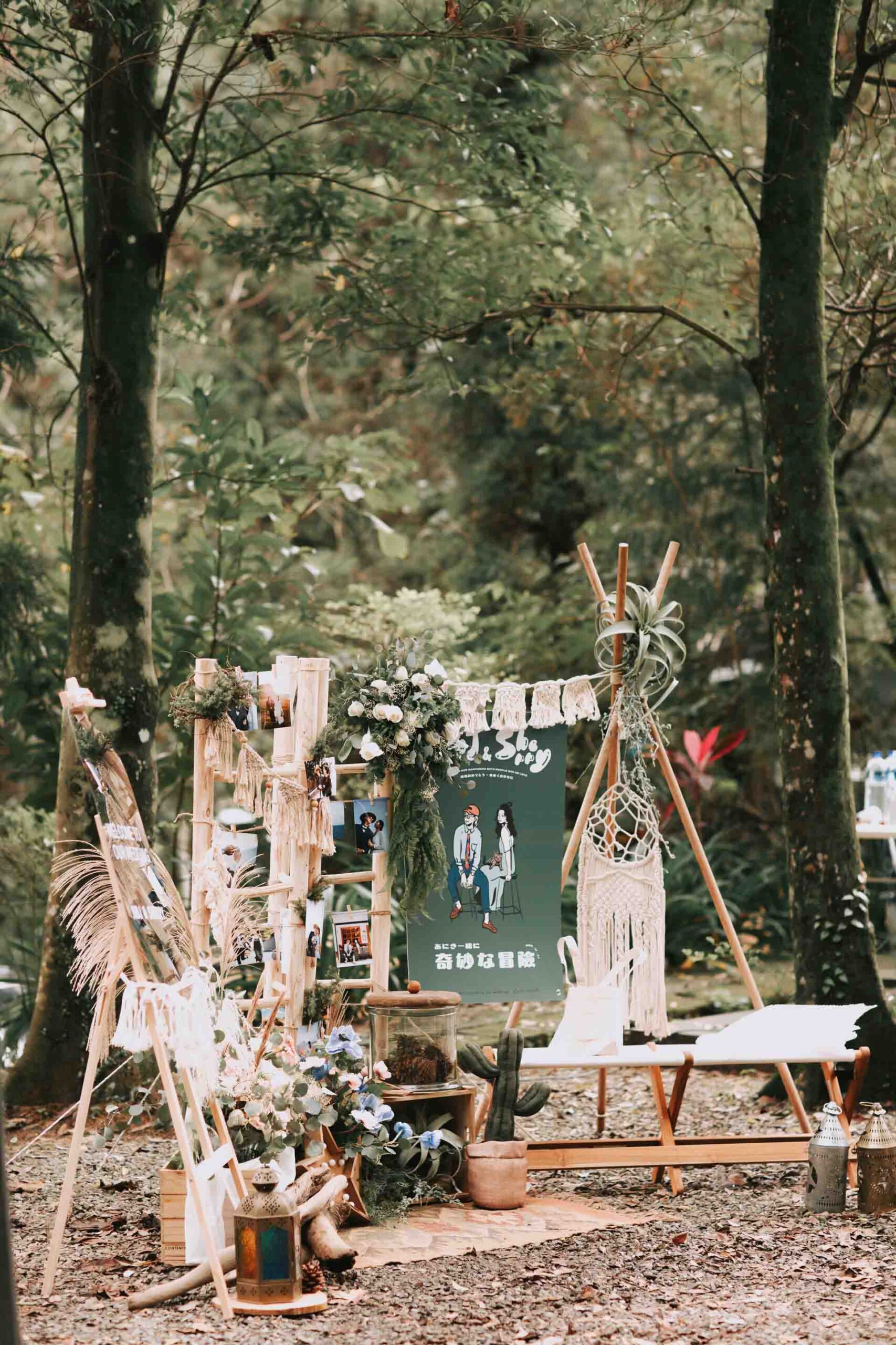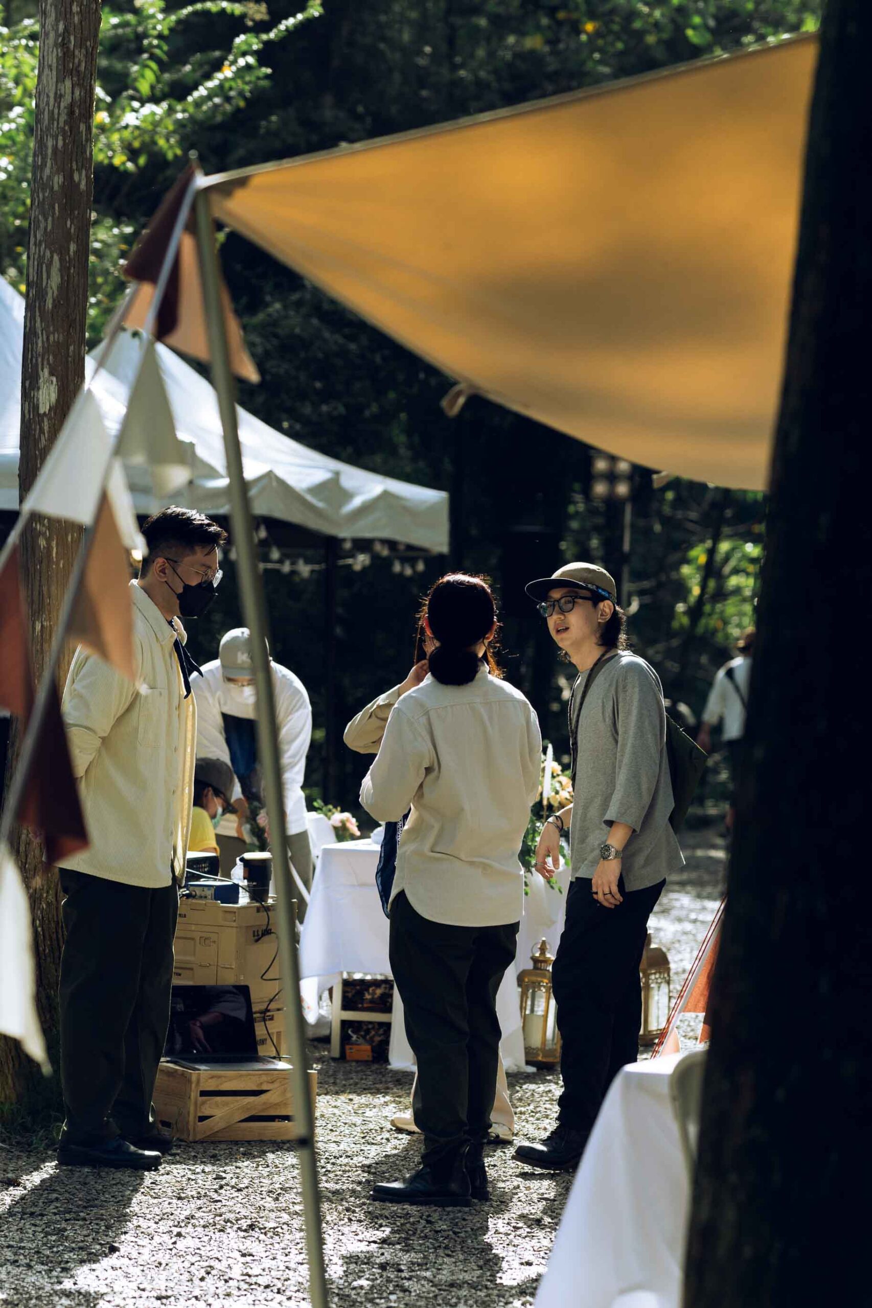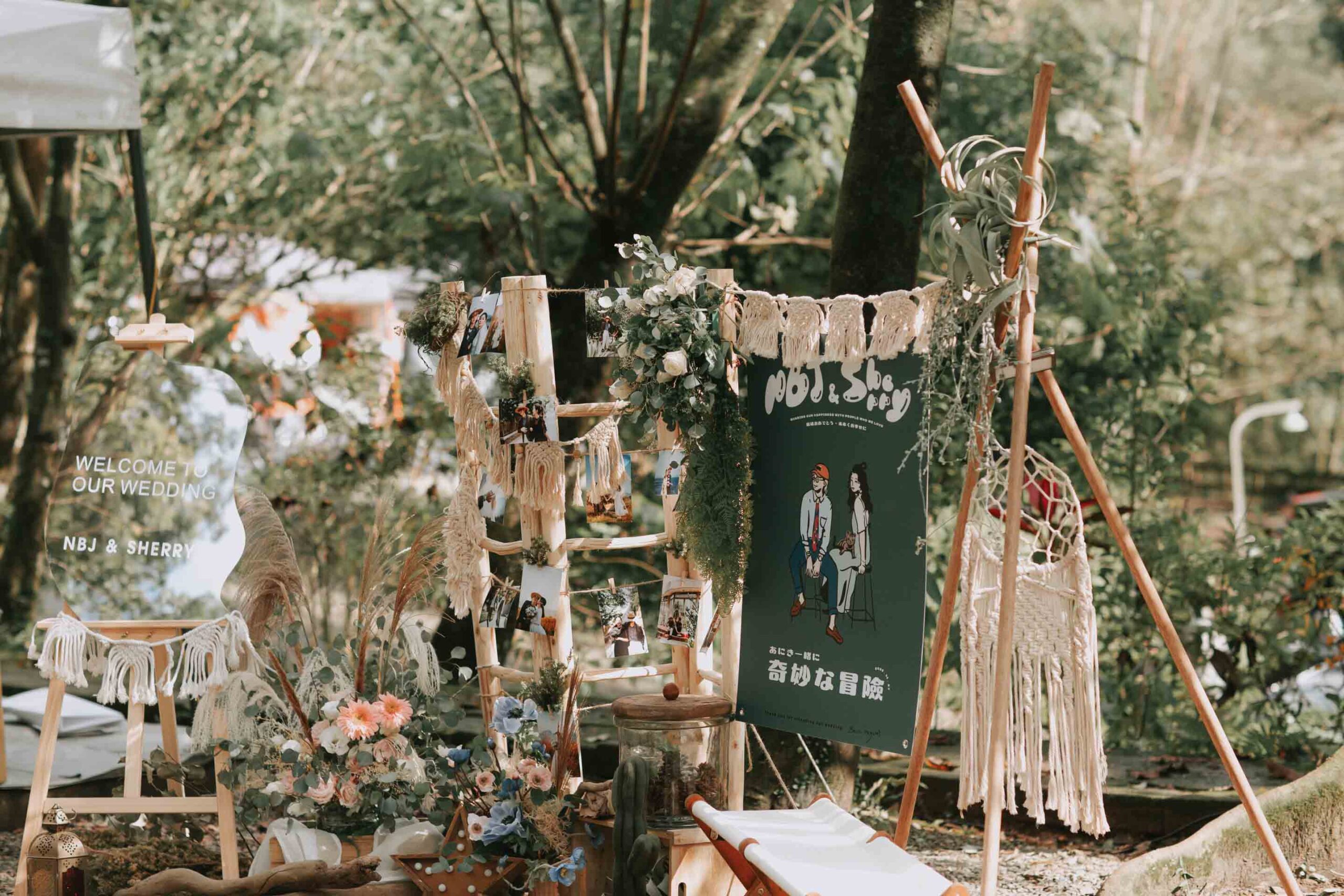 NBJ 與 Sherry 找的是 Saibaba 主理人 Hsin Fan 幫忙操刀。Hsin Fan 有非常豐富的戶外婚禮布置經驗,交給他們處理,新人可以非常放心。不過兩人也提醒,若找上像是 Hsin Fan 這種風格比較強烈的婚禮布置團隊,就表示認同他們的風格,而非明知對方做的是日式風格,卻要對方做出美式感覺。兩人建議,要尊重創作者,可以提需求,看雙方如何配合,而非要求風格的大異動。