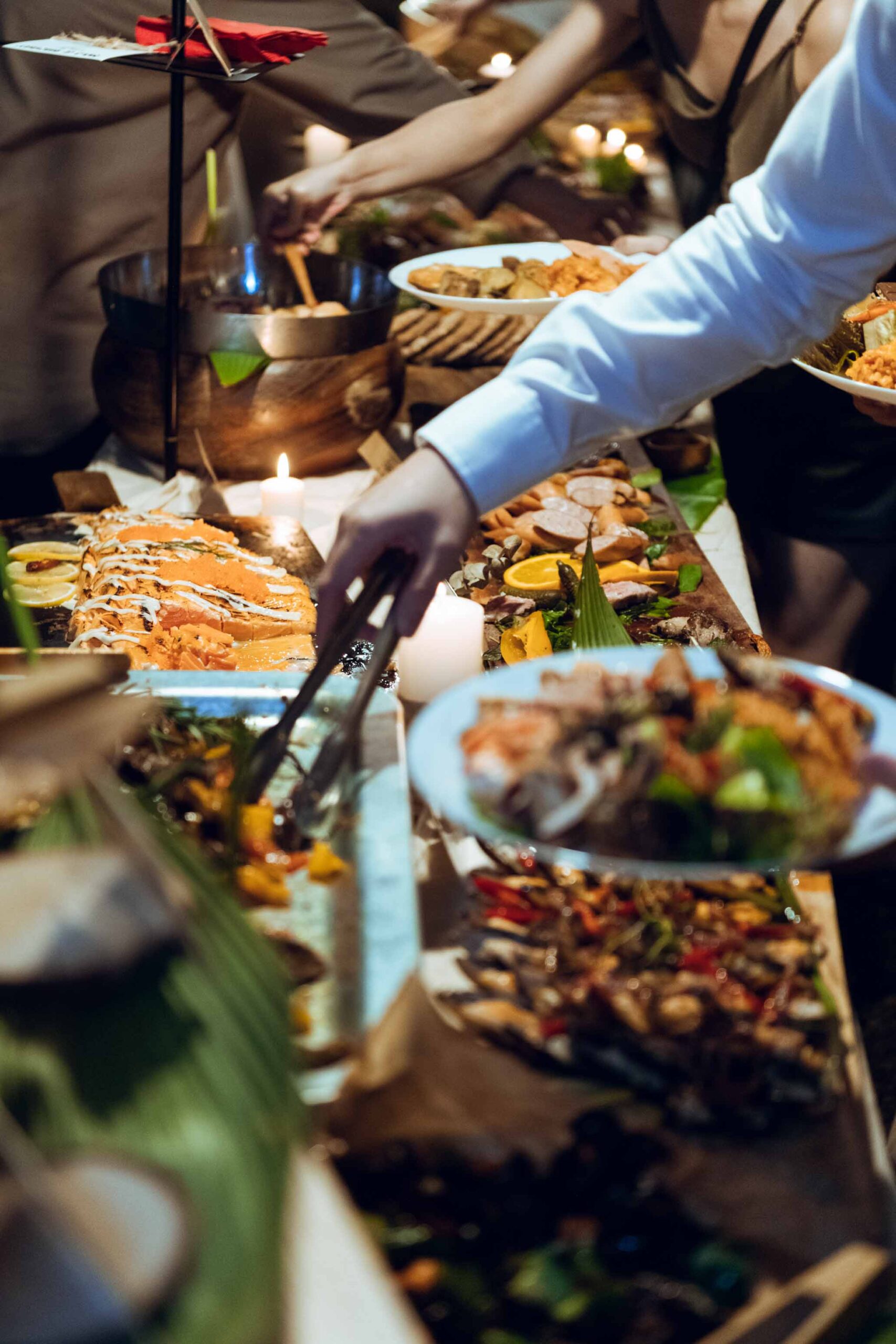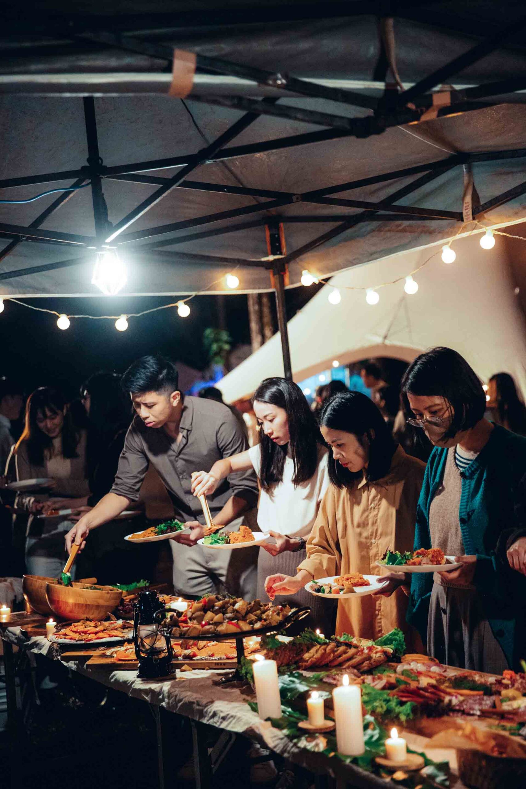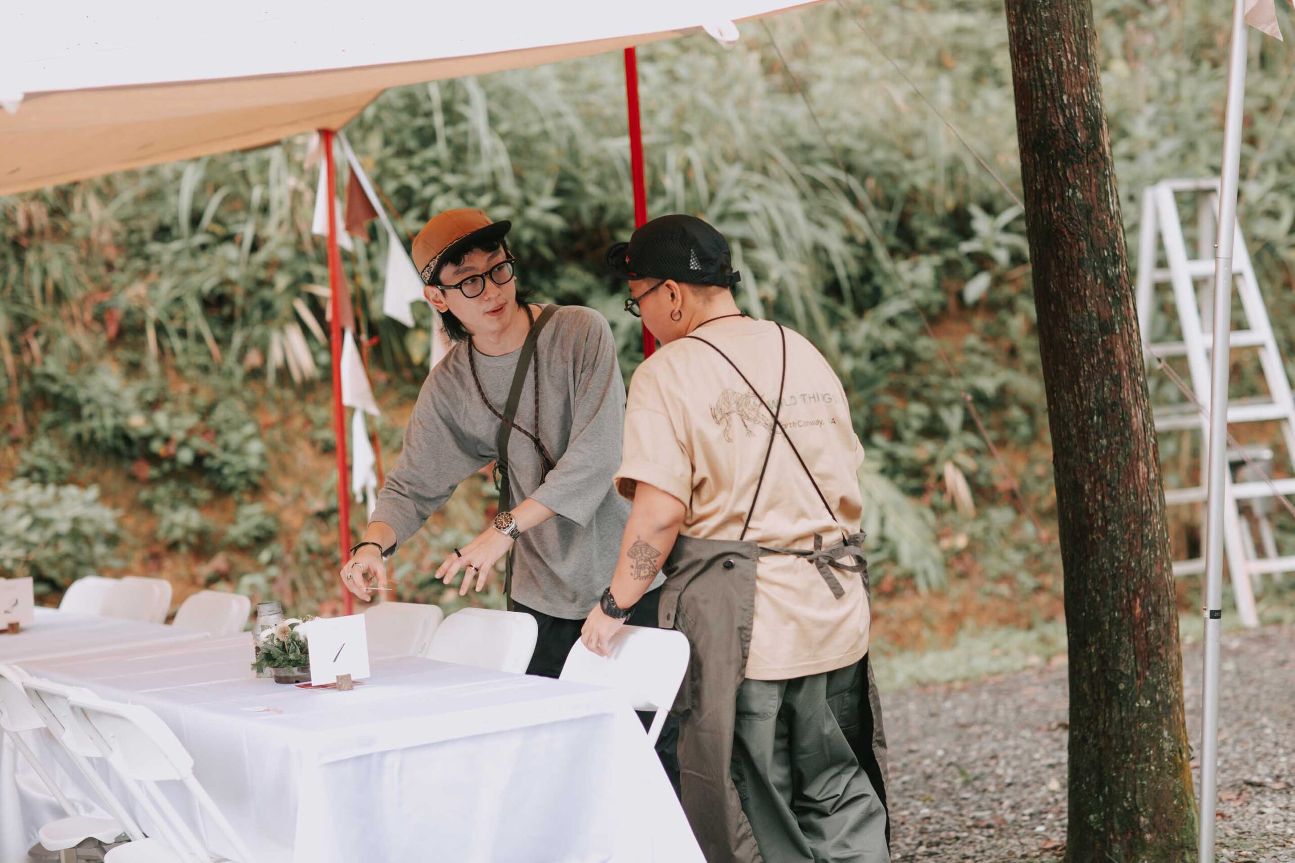 參加過幾次戶外婚禮,NBJ 與 Sherry 對於自助式取餐頗有微詞,兩人認為自助式容易造成大排長龍、出餐空窗期等問題。因此兩人在與餐飲團隊溝通時,就提出希望可以採用一道道上餐的方式送到賓客桌上。然而,他們很快就發現,之所以許多人沒有這樣做,背後是因為一個最大問題:預算。