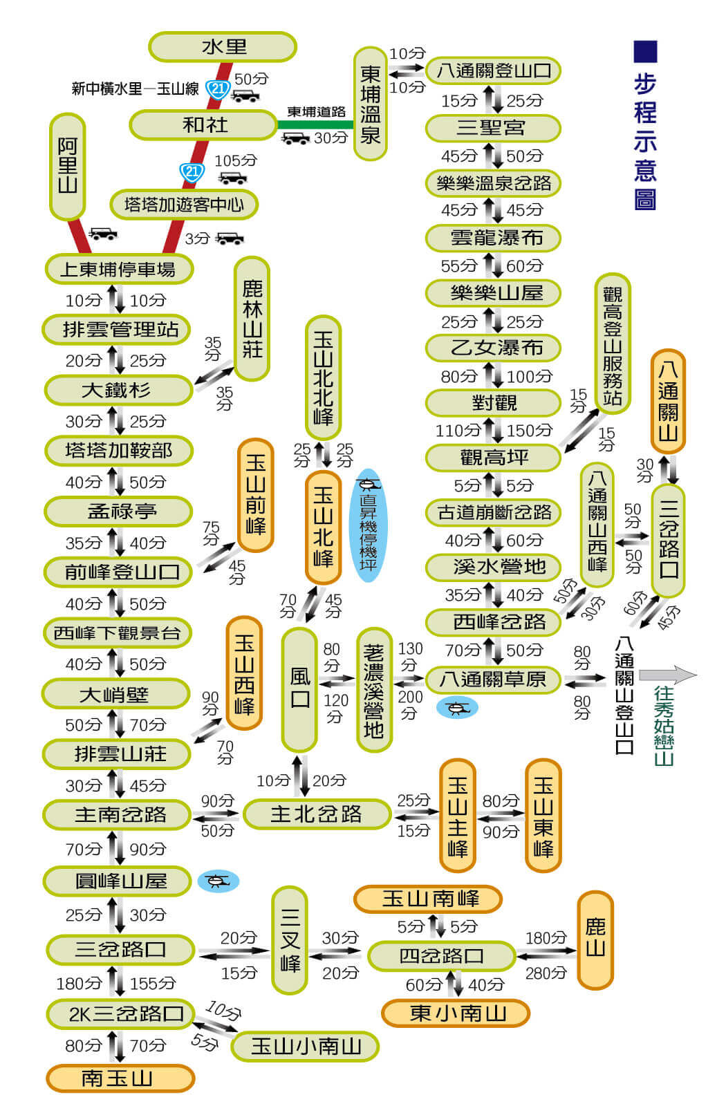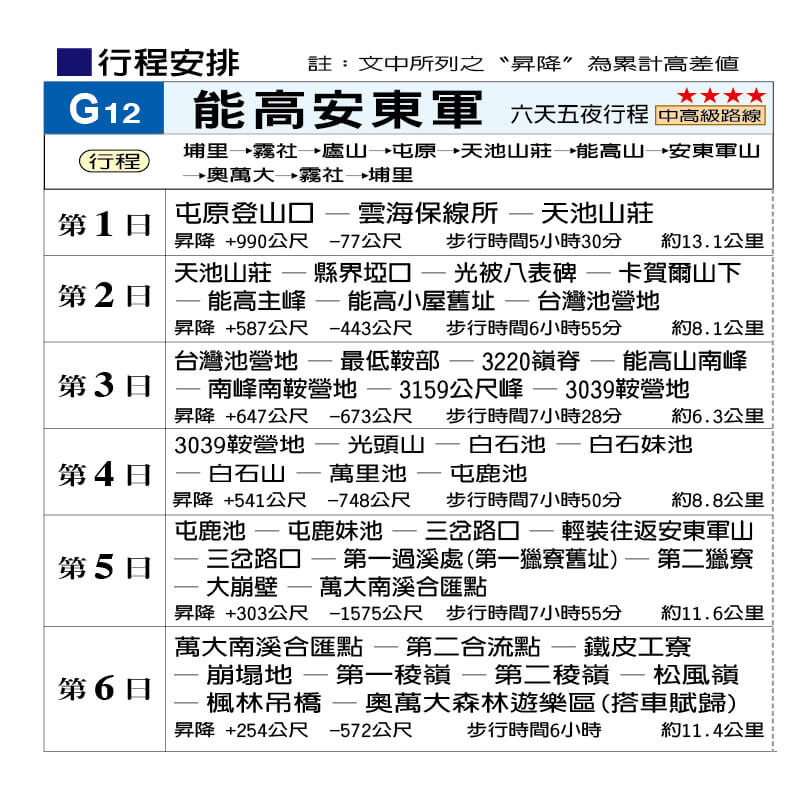 此外,登百岳最需要的山屋營地、水源、步程 (也就是上河時間)、高低差也都有清楚記載。