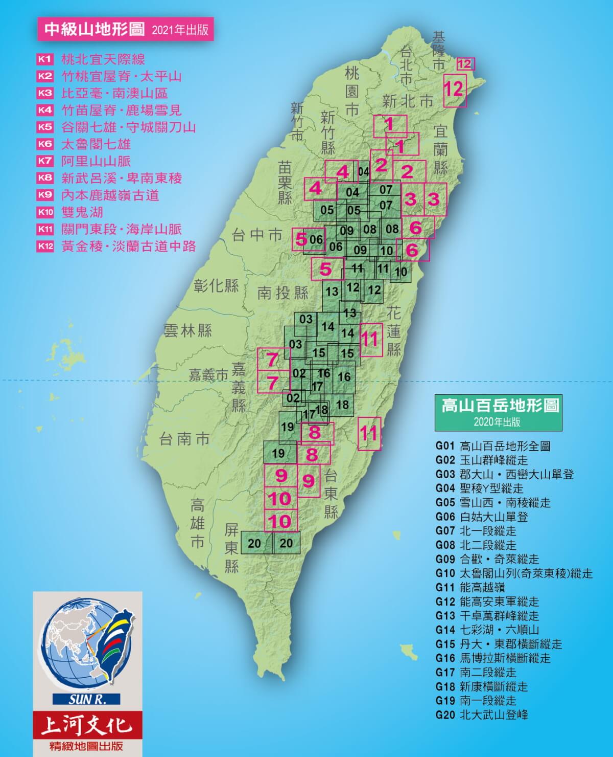 全台灣獨一無二的高山百岳地形圖,在 2020 年出版。這套地圖是上河文化採用最先進的空載光達測繪而成,無論是山稜、溪谷、水塘、路徑、史蹟都相當精準地標註出來,且搭配易懂的配色,讓草原、崩塌、岩屑、森林等地形也更清楚易讀。