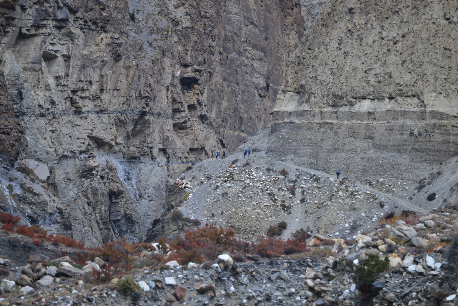 通往 Phu 村 ( 4,080 米)的路線基本是沿著 Phu Khola 峽谷一路向上,坡緩但漫長,千百萬年的河流沖蝕讓這段峽谷顯的特別峭立險峻,底下的 Phu 河則在其中幽幽的蜿蜒,這條河的源頭正是來自 Himlung 的冰河,雖然聽起來很清澈,但實際上河水的顏色像是富含石灰質般的淡濁,我好奇的隨口問了河裡是否有魚? 其他人則異口同聲的回我不可能,因為河水溫度太低無法形成生態鏈,想想我還真是問了個笨問題。