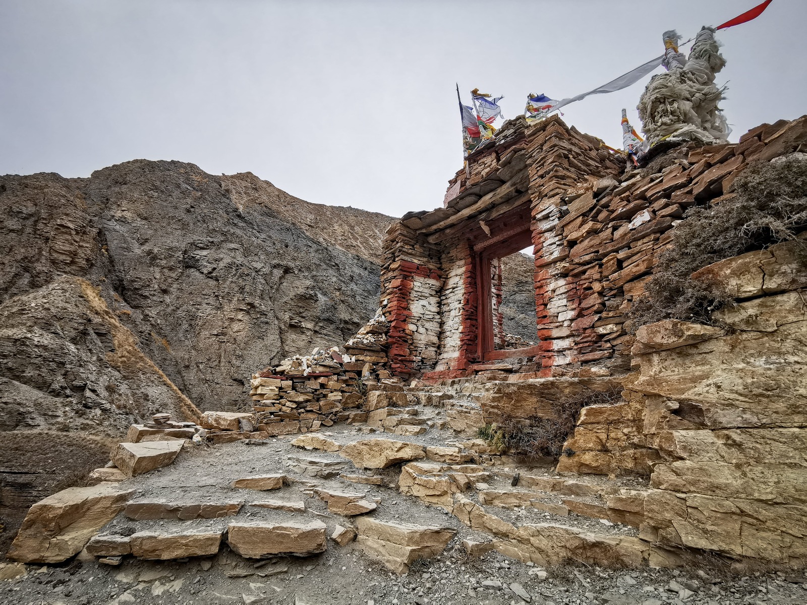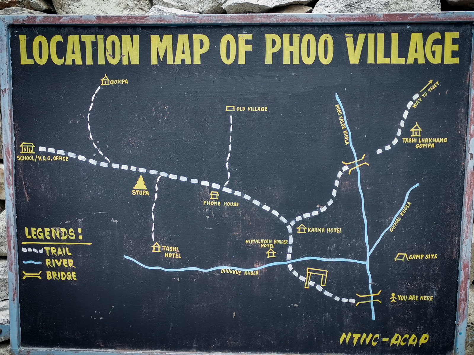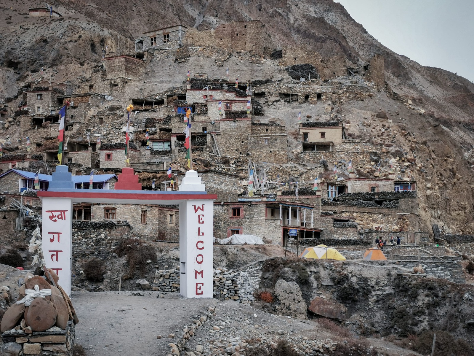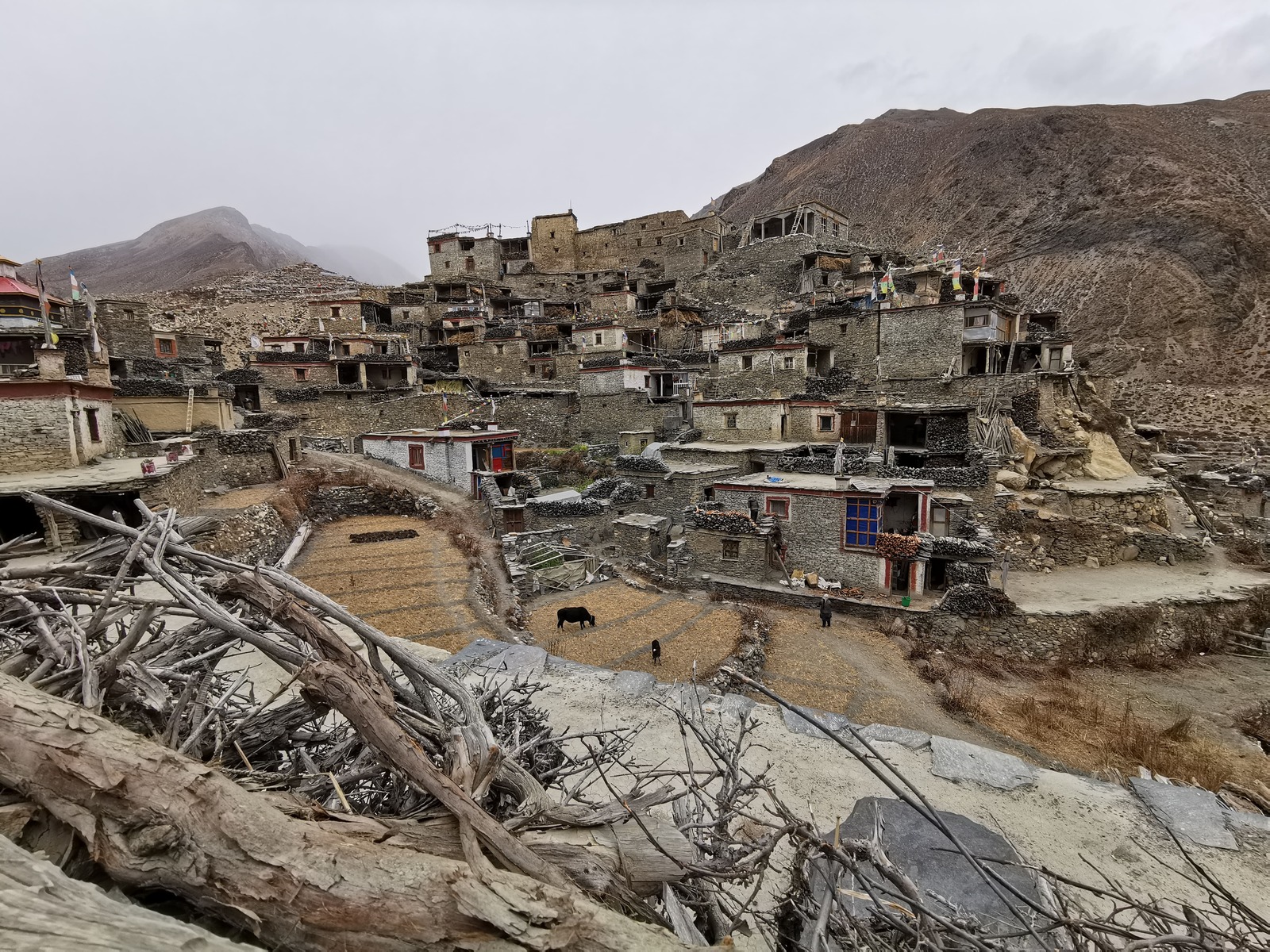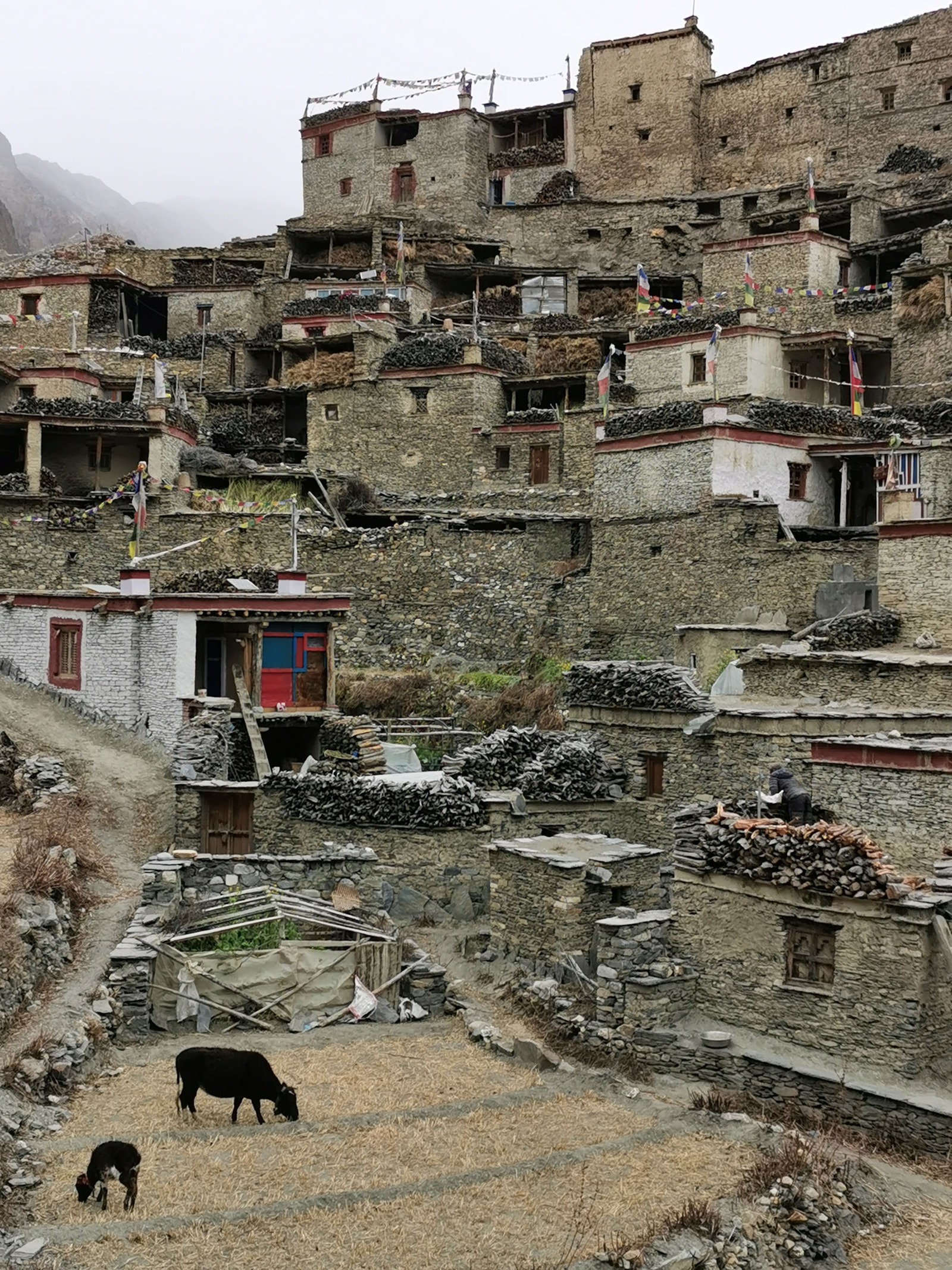 初入 Phu 村會被那些蓋在山丘上的傳統建築所吸引,未加粉飾的石房星羅棋布的堆疊在山壁上,遠看時原以為是堆疊在一起的,走近後才發現它們其實亂中有序,緊湊的空間布局如梯田般的層層堆砌,漸寒的深秋使這的土地片片橙黃,這裡是隱身在尼泊爾北方喜馬拉雅山裡的遺世村落,自給自足的生活讓這裡的村民們降低與外界接觸的頻率,如此一來傳統文化與生活方式得以世世代代的保存下來。 而根據維基百科的記載,Phu 村在 2011 年的人口普查僅有 176 個居民與 36 個家庭,實際走入村里我忽然有個念頭,這一帶貧瘠的土地讓這裡感覺很像是一個暫時的聚落,彷彿最初的人們只是暫時移居這裡等待著心中的黎明,只是不知什麼原因的最終只能定居在這裡,村口一個不起眼的立牌上畫著簡單的地圖,上頭標示著路再往北直直去就可接上西藏,也許那個遠方才是這裡一切的源頭,就像隨處可見的白馬五色旗,旗上的經文隨著風在這裡飄盪,也飄盪在故鄉。