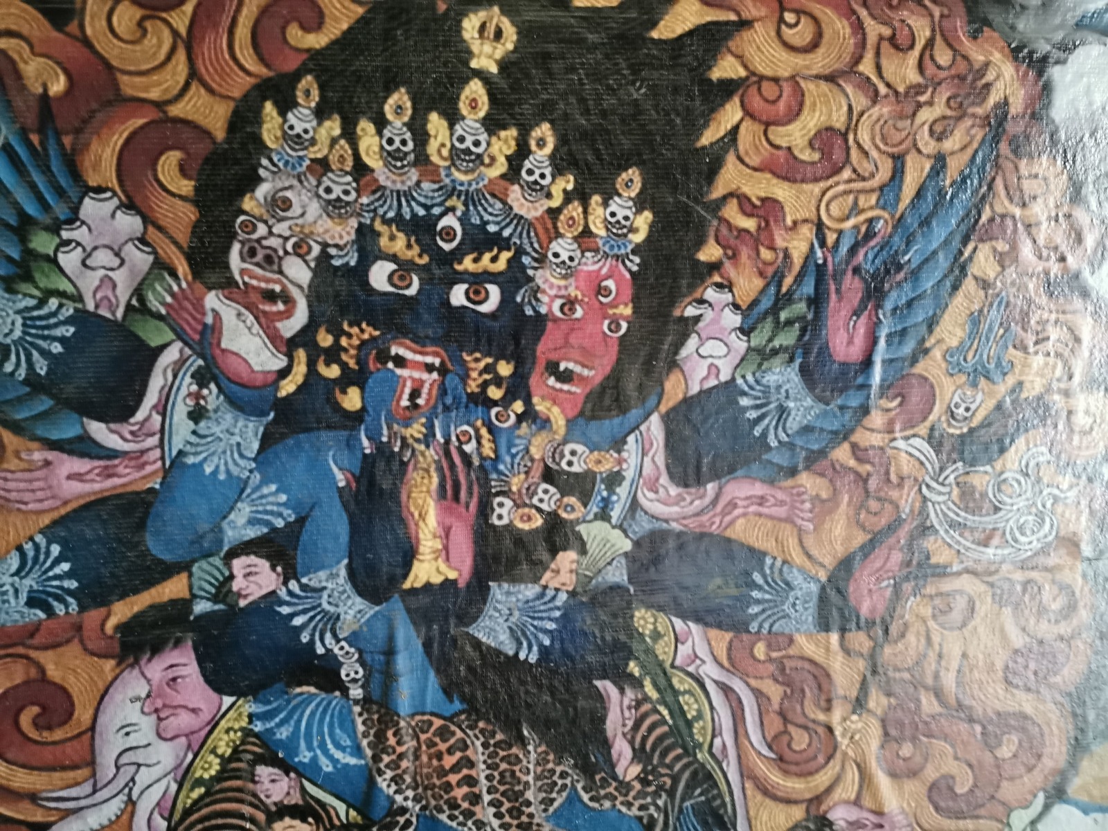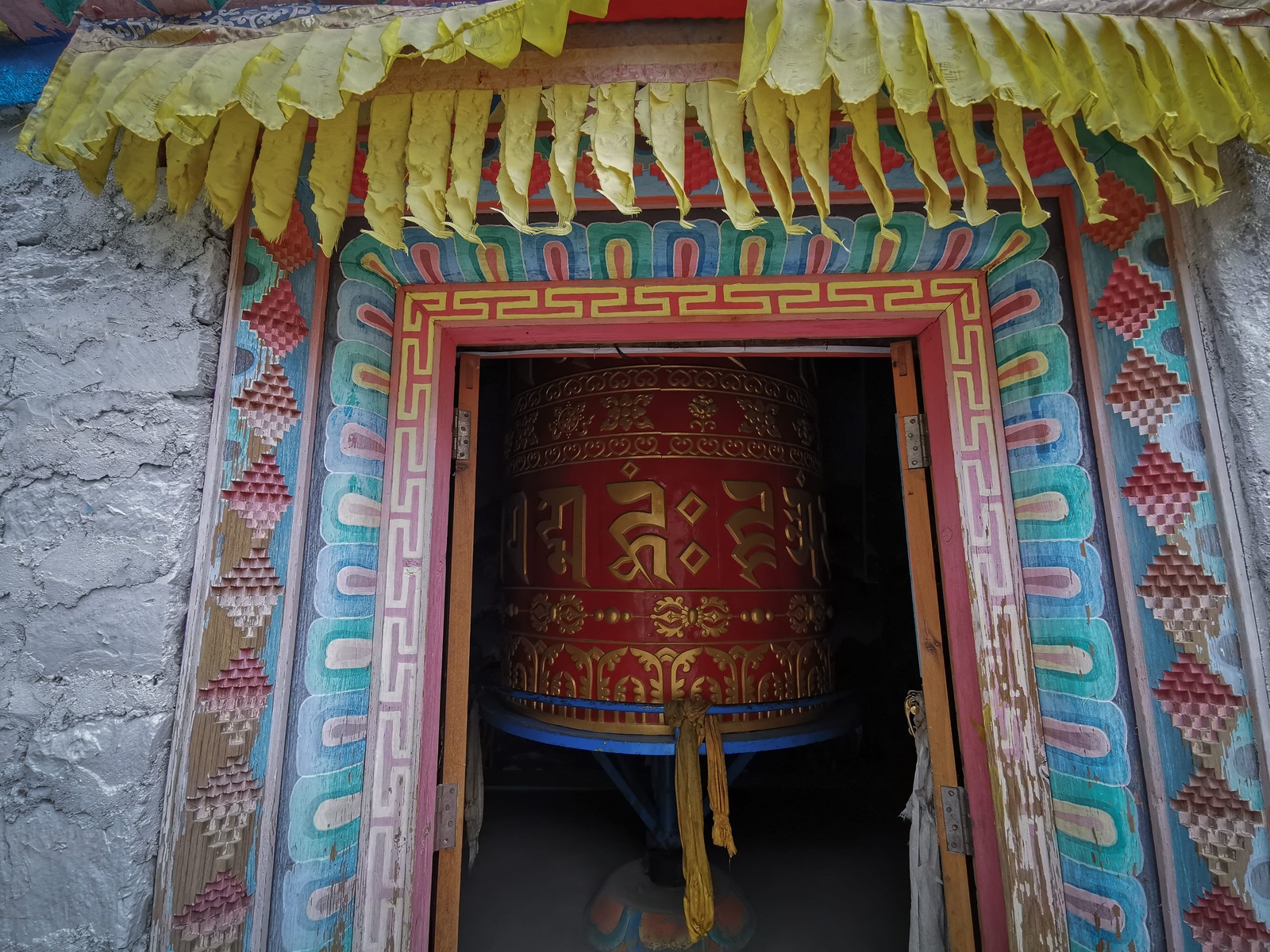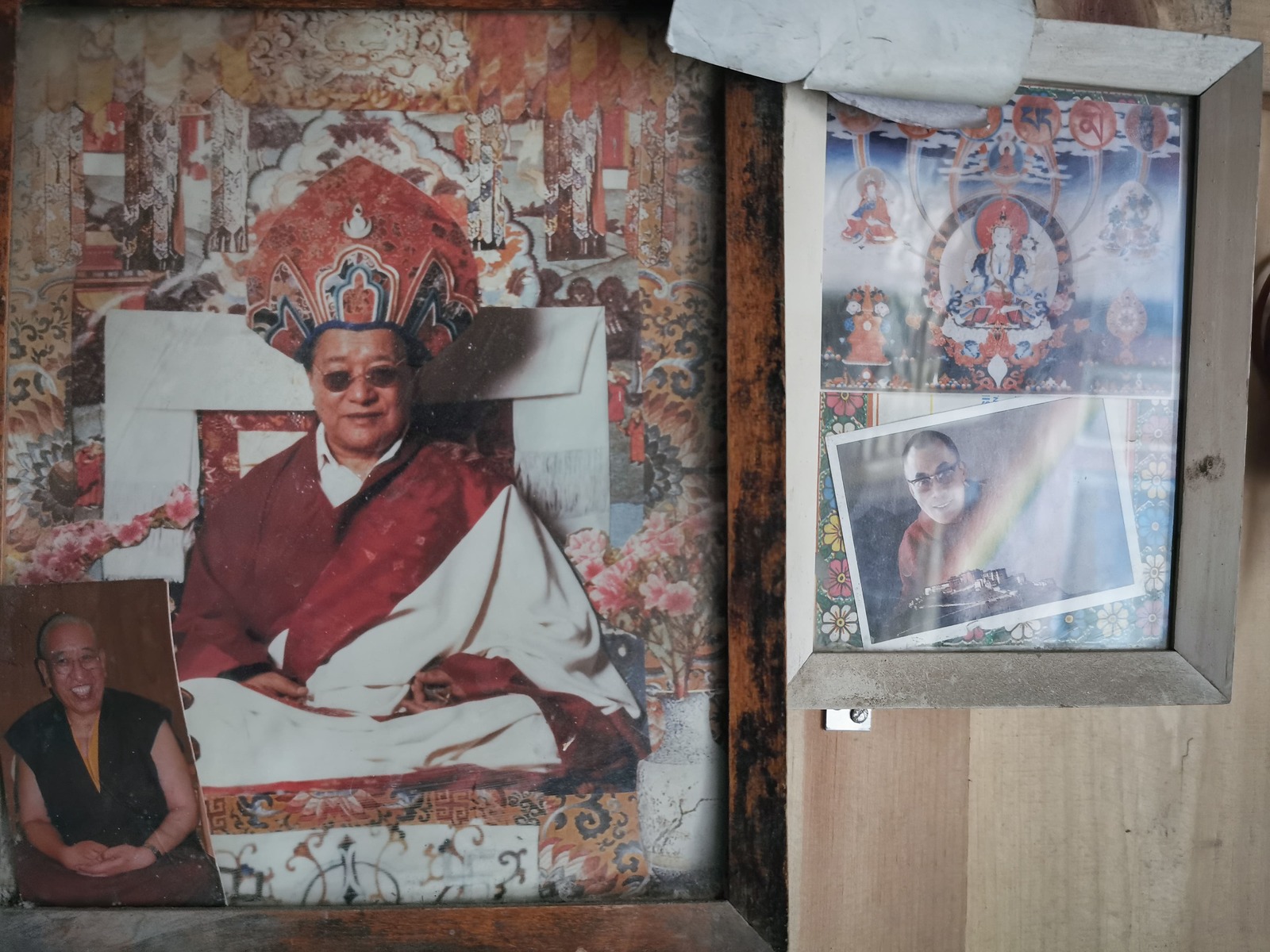 秋冬沒有農作,村里的青稞田也在過冬,牛隻悠閒的嚼著黃草,村民們有的坐在門口織著毛線,有的則在工作著,漫步在這安靜的村落中任由時間慢慢流淌,我走進一個微型的藏教佛塔,裏頭有個很大的轉經鐘,具歷史感的白度母壁畫有修復的痕跡,另一個角落則有達賴與另一位我不認識的高僧照片,一同掛在牆上。