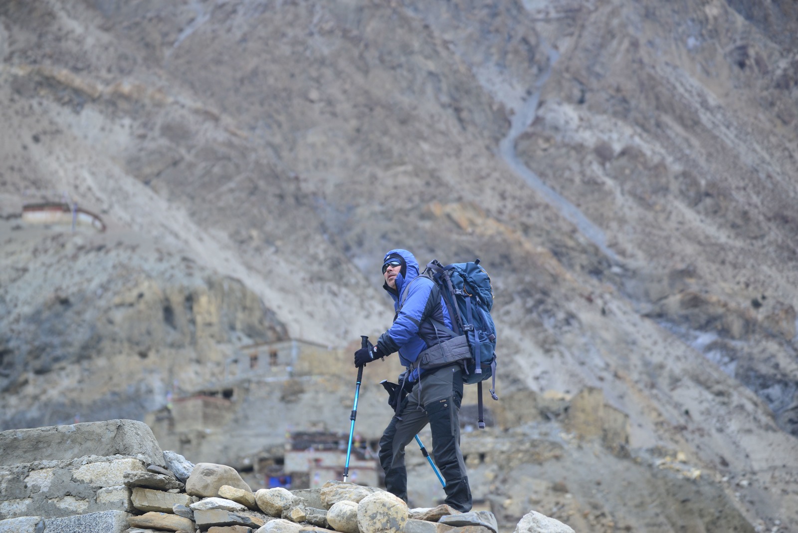 腳上這雙 Hanwag Alaska GTX 登山鞋的大底刻紋設計的不差,無論怎樣的步伐都能讓我穩健的咬住混著碎石與泥土的斜面上升,然而就在順利上登到第一個之字轉角時,上方竟傳來驢隊的銅鈴聲並快速接近中,此時的我正位於崖面,地形坡度的限制讓我無法在短時間橫移到另一頭的壁面,當下我就像隻受驚嚇的青蛙,轉身死命抱住崖邊的一塊岩石,此時大約 10 幾隻的驢隊開始在我身後陸續陡下,震耳欲聾的踏步聲捲起漫天的黃土沙,這路實在太窄了,其中幾隻驢子背上兩側的塑膠桶甚至在經過的瞬間與我的背部相摩擦,我想人在囧途大概就是這個意思,那把甘道夫手仗也早就被驢子們踢到山下,現在回想起這段經歷絕對是一生難忘的名場面,誰都沒想到自己的性命會掌握在一群驢子身上吧~