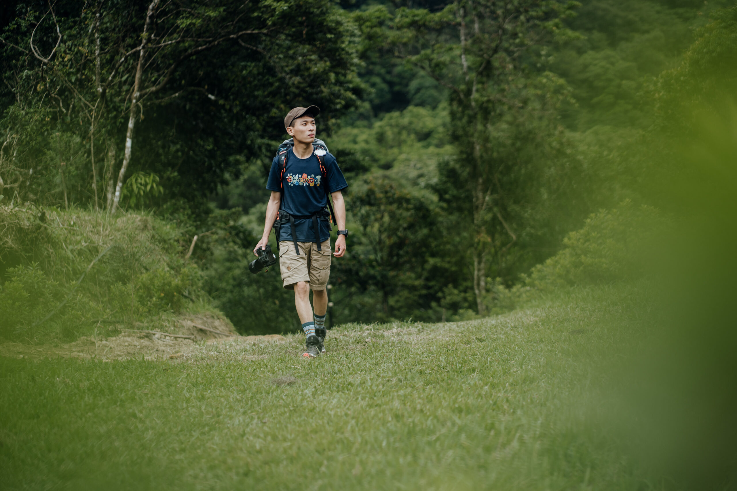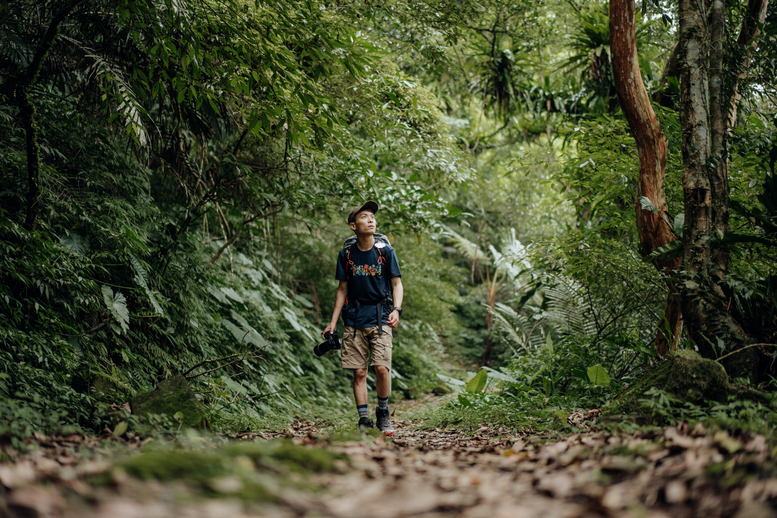我們繼續漫步在灣潭古道上,伴隨著的是亞熱帶季風氣候特有的雨林樣貌,踏足石階往上走的過程中,康康語重心長地說:「當你在走上坡的時候,雖然很痛苦,但你是往高處去;而當你走下坡時,感到很輕鬆,但你可能在往谷底走。」他認為戶外很像是人生的縮影,唯有時刻關心大環境,以及抱持著開放且不自我設限的態度,才能莫忘初衷,持續用自己的攝影之眼,將台灣之美帶給更多的人看見,而這也是他回報養育自己這片土地的方式。
