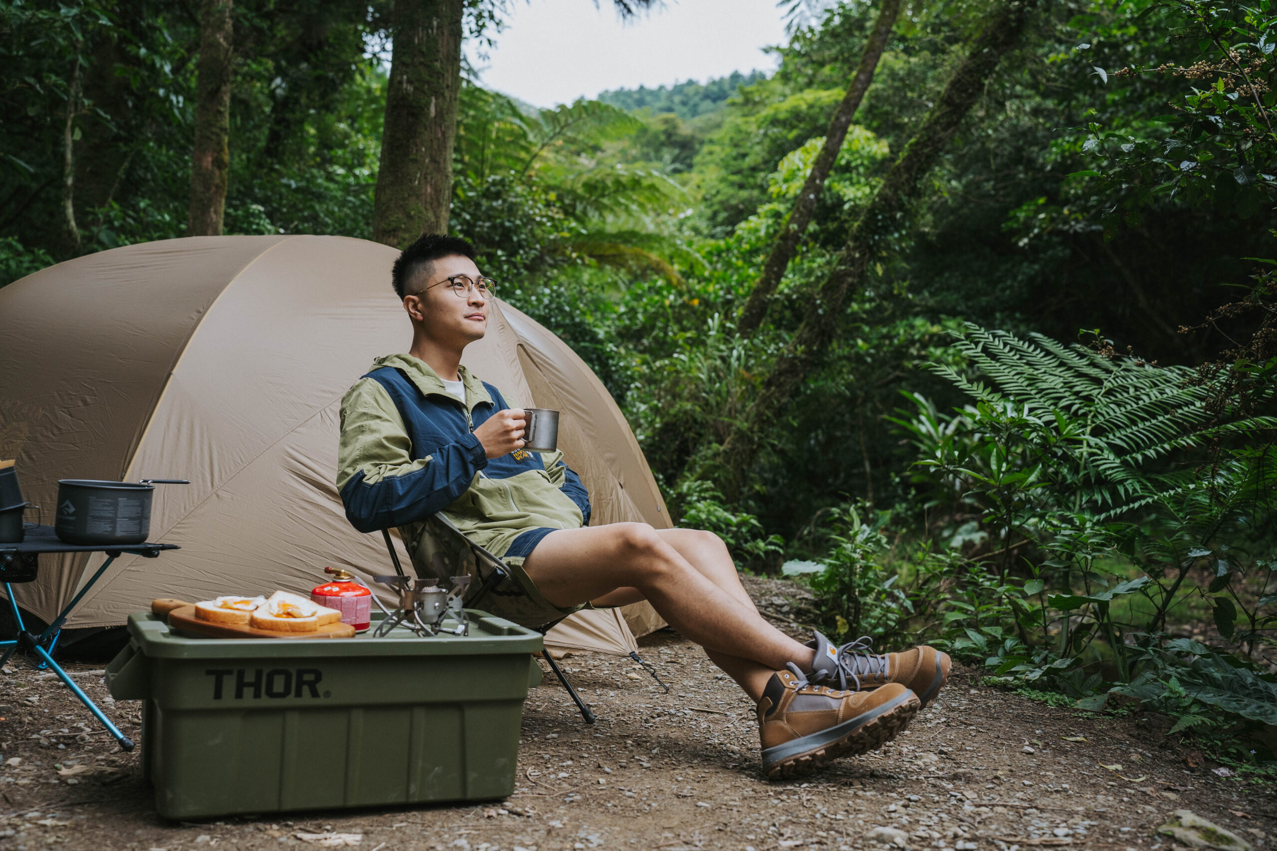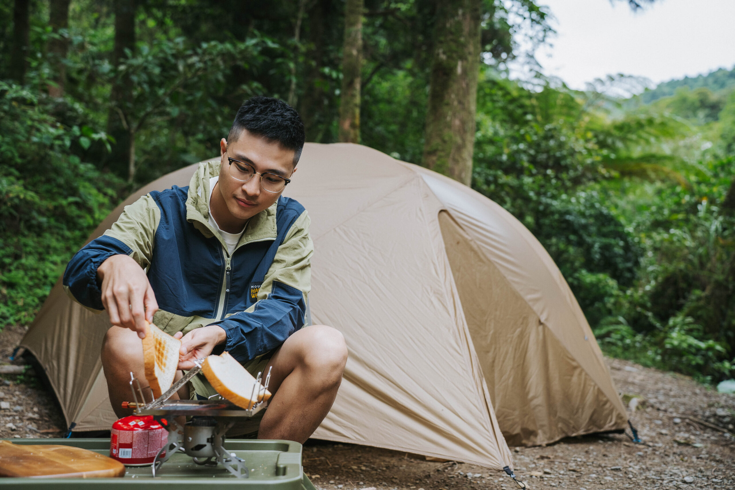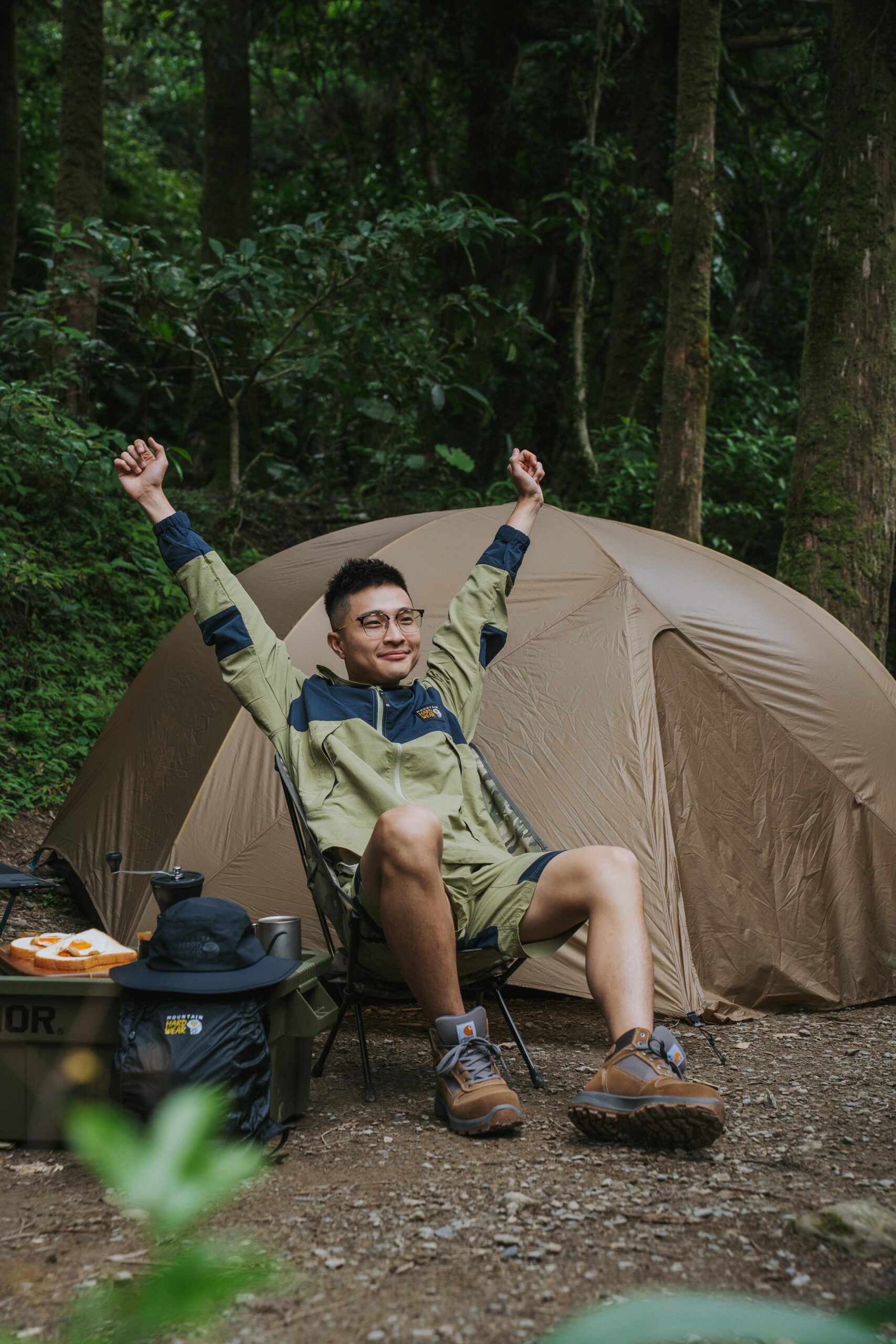 在澳洲旅居的四年,Wei 有超過一半的時間皆是從事輕隔間室內裝修工作,長期處在高壓的工地環境下,也讓他在工作之餘只想走入大自然,地廣人稀的澳洲大陸更擁有許多腹地廣大的露營區,他說:「露營烤火的氛圍,讓我能釋放工作的高壓,得到短暫的平靜。」許多人會說露營就像是成人版的扮家家酒,凡事必須親力親為,自己搭帳篷、生火、烹飪,所獲得的成就感,有時候甚至遠大於職場,就這樣 Wei 一頭栽進了露營的世界裡,也開始著手購入屬於自己的露營裝備,這時候才發現在澳洲要找到適合亞洲人版型、擁有風格外型與機能兼具的戶外衣著真的有些困難,只好把城市衣著穿到戶外去:「我居住的昆士蘭州,經常會有單體雷暴,雨量大到不行,那時候穿錯衣服變成落湯雞超慘的!」Wei 接著與我們分享在布里斯本露營的慘痛經驗,而今日 Wei 實著的 Mountain Hardwear 日系款衣著則完全解決了這項痛點,兼具日系風格及搭載戶外機能,即便是如同今日炎熱潮濕,天氣多變的山林間露營,都能應變各種情境。