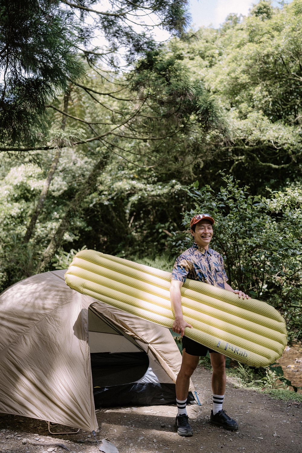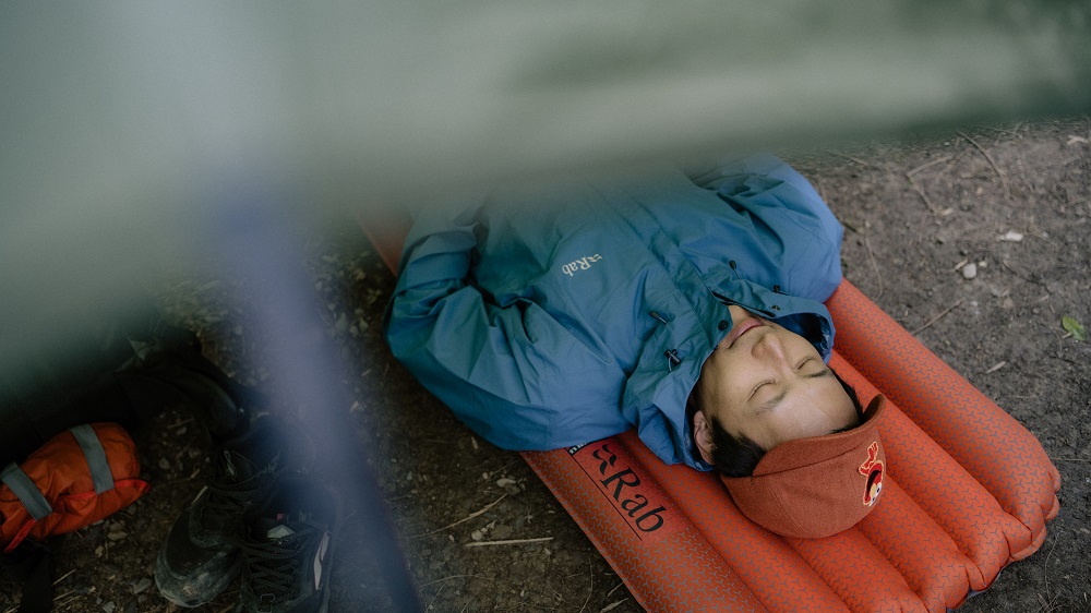 「Rab Ionosphere 5 可以選擇拿來搭配搭帳棚時使用,因為他重量相對最輕,可以分擔帳篷的重量,而且 R 值達 4.8,厚度有8公分,550g的重量較同類型隔熱保暖睡墊輕。躺下去沒有貼地的問題,還有很重要的一點,很多睡墊在與人體接觸時會產生很多噪音,但 Rab 這幾款都相對安靜許多,可以讓自己好睡,也不會影響到別人。」