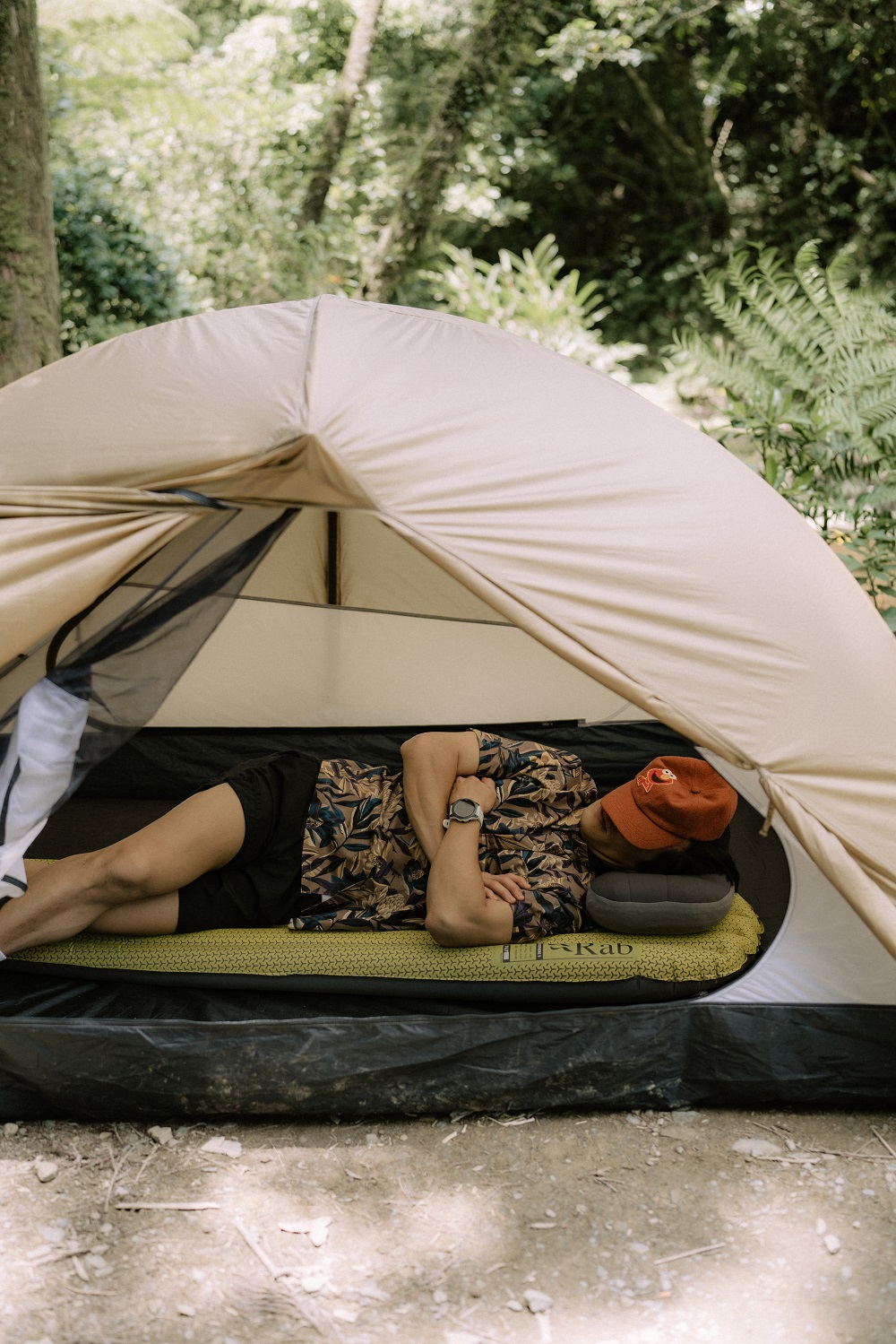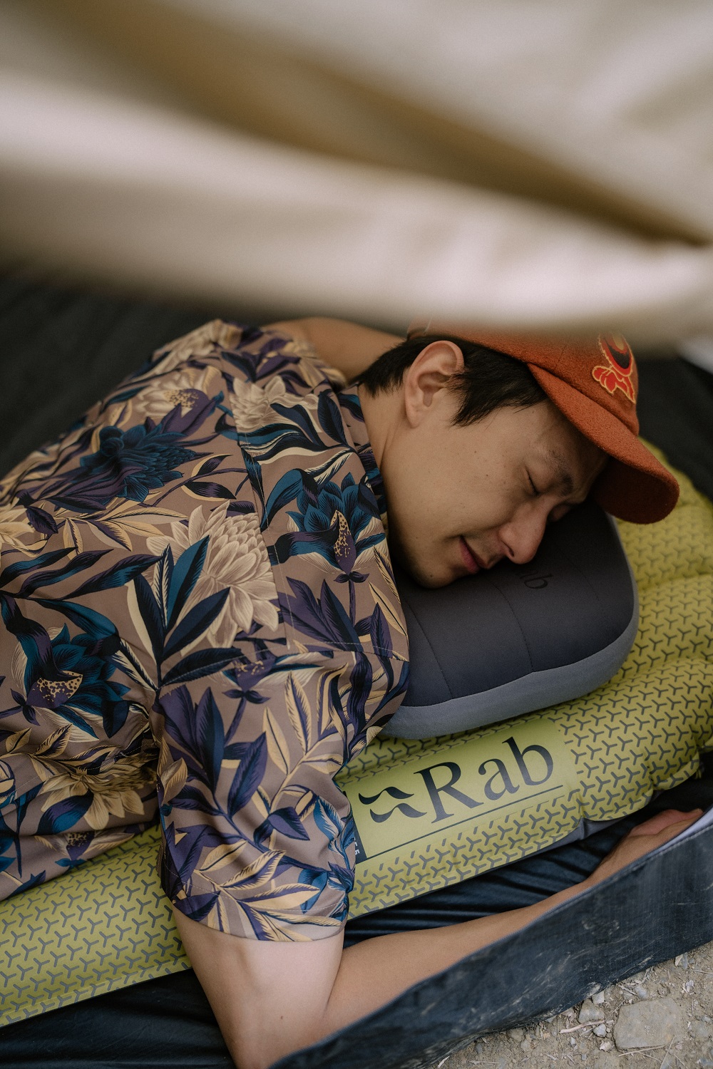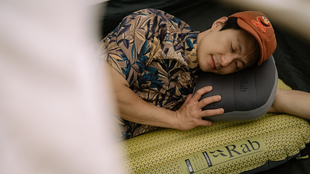 雖然平時 Elmo 大多以蛋殼睡墊為主,但對於睡眠品質可說是時好時壞,Elmo 更知道自己需要一個能夠舒適過夜,減少高山症發作的睡墊有多重要。「以睡墊的挑選重點,我第一個會看睡墊的R值、厚度來做第一階段的篩選。像今天一次體驗到 Rab 三款睡墊,Ionosphere 5 最輕、Ionosphere 5.5 最保暖、Exosphere 3.5 最適合露營使用。今天的氣溫有點涼意,躺在 Rab 的睡墊上舒服到都快要睡著了!」Elmo躺著伸懶腰跟我們說著。