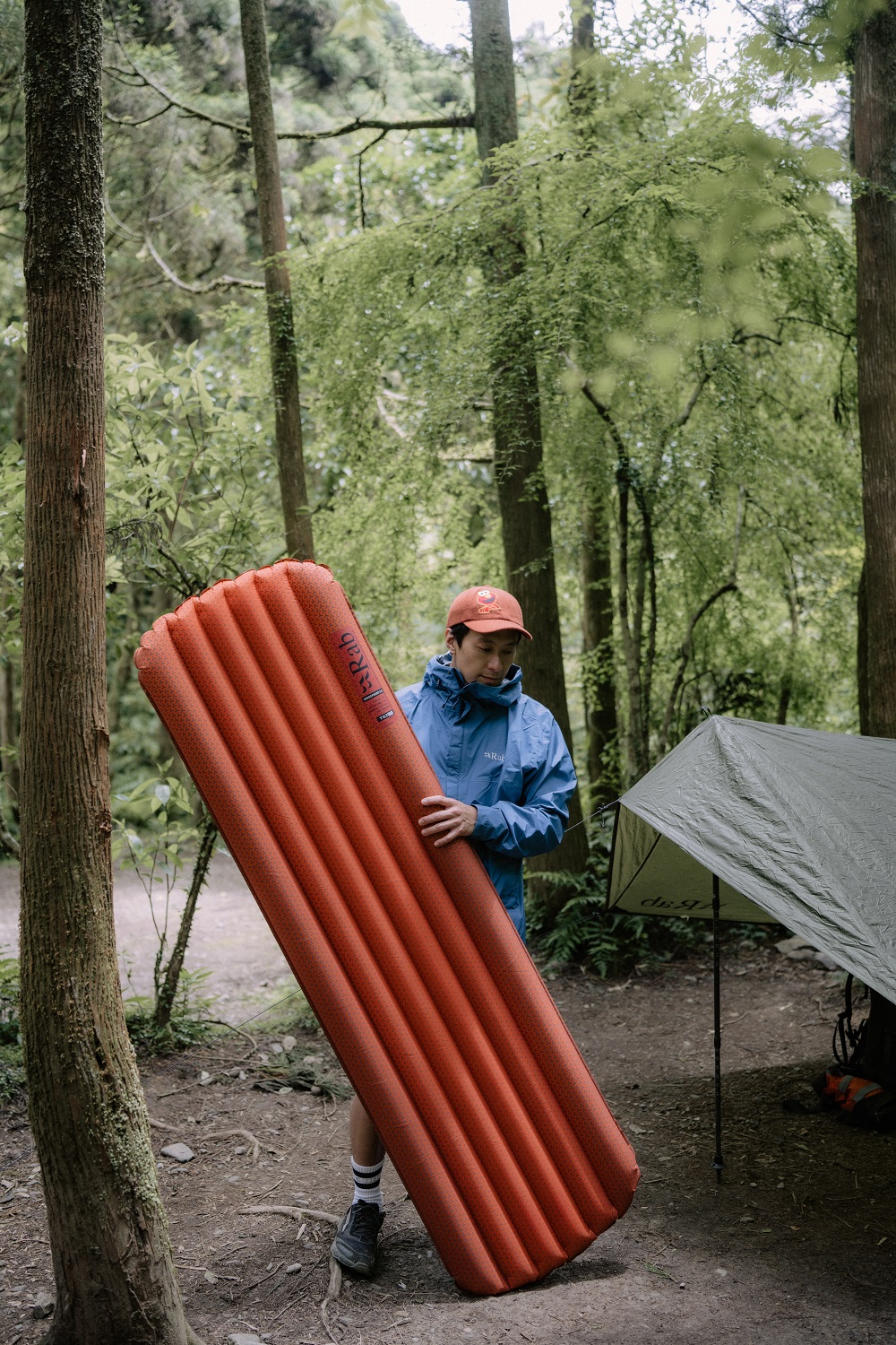 若選擇天幕紮營,睡墊的保暖度就要更加謹慎,Ionosphere 5.5 與5一樣都是8公分的厚度,但R值達5.5,重量690g,「我之前有試過別家品牌,當時為了輕量化選擇最薄的款式,結果一躺下去很多部位都是直接碰地,要睡在天幕底下,厚度一定要夠厚。今天躺在 Ionosphere 5.5,身體都沒有接觸到地面,確實是睡在床墊上的感覺,寬度設計也很剛好,我的兩個肩胛骨凸出的地方,很剛好的包覆在直條紋的凹槽裡面,也因此身體不會一直有向外滑出去的情況。」