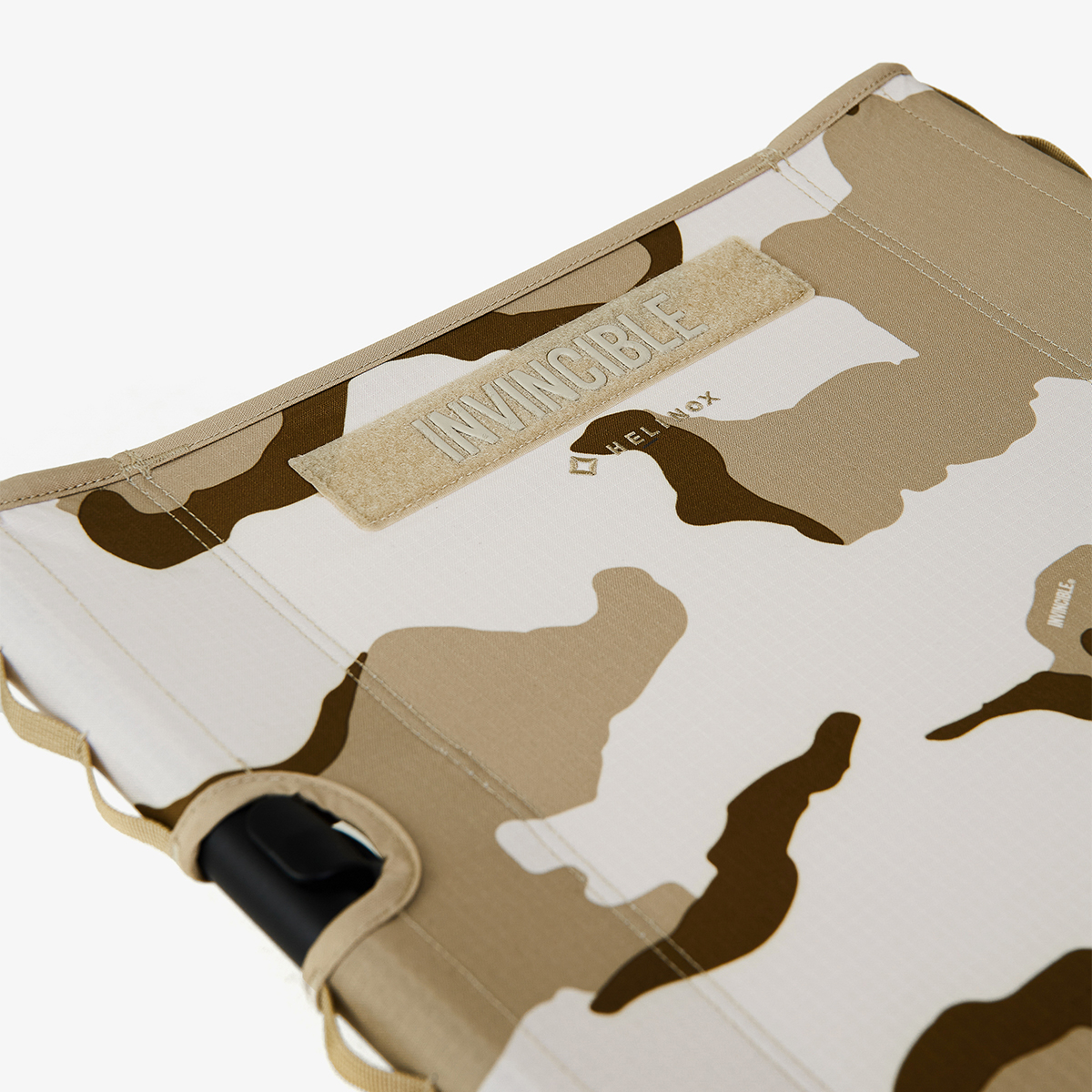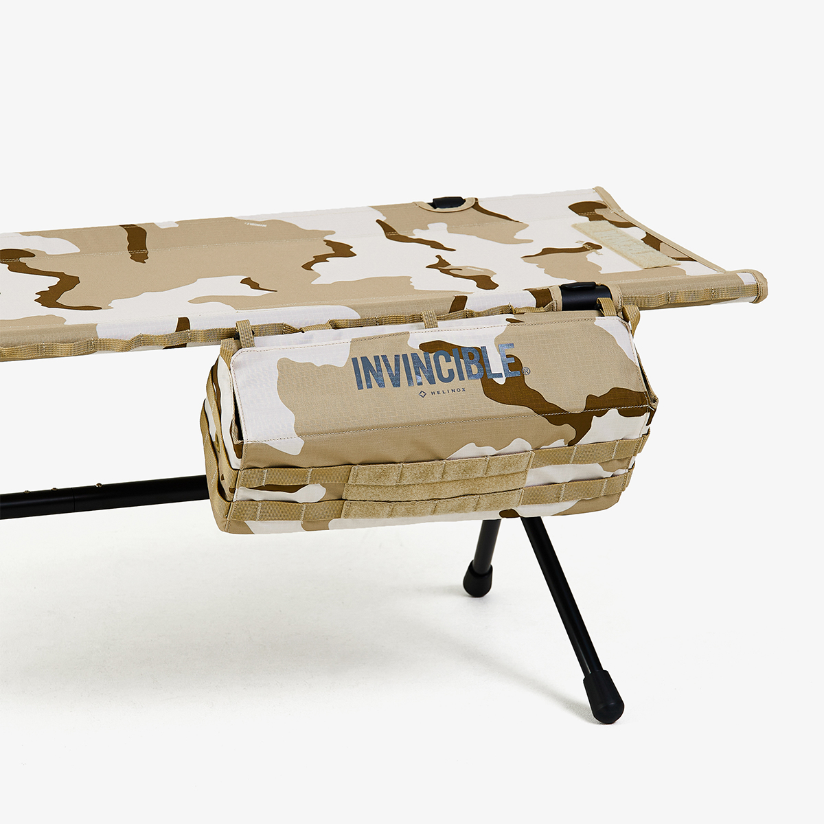 Tactical Bench 戶外長椅除了有視覺搶眼的沙漠迷彩,戶外長椅有著堅固、輕量且好收納、組裝DAC鋁合金支架,搭配防撕裂抗水 Ripstop 布料,邊緣配有 Molle 外掛織帶系統,可加裝配件,INVINCIBLE® Logo 設計概念起於魔鬼氈姓名貼條,融合於沙漠迷彩設計,完美將機能裝備與戶外流行融合。