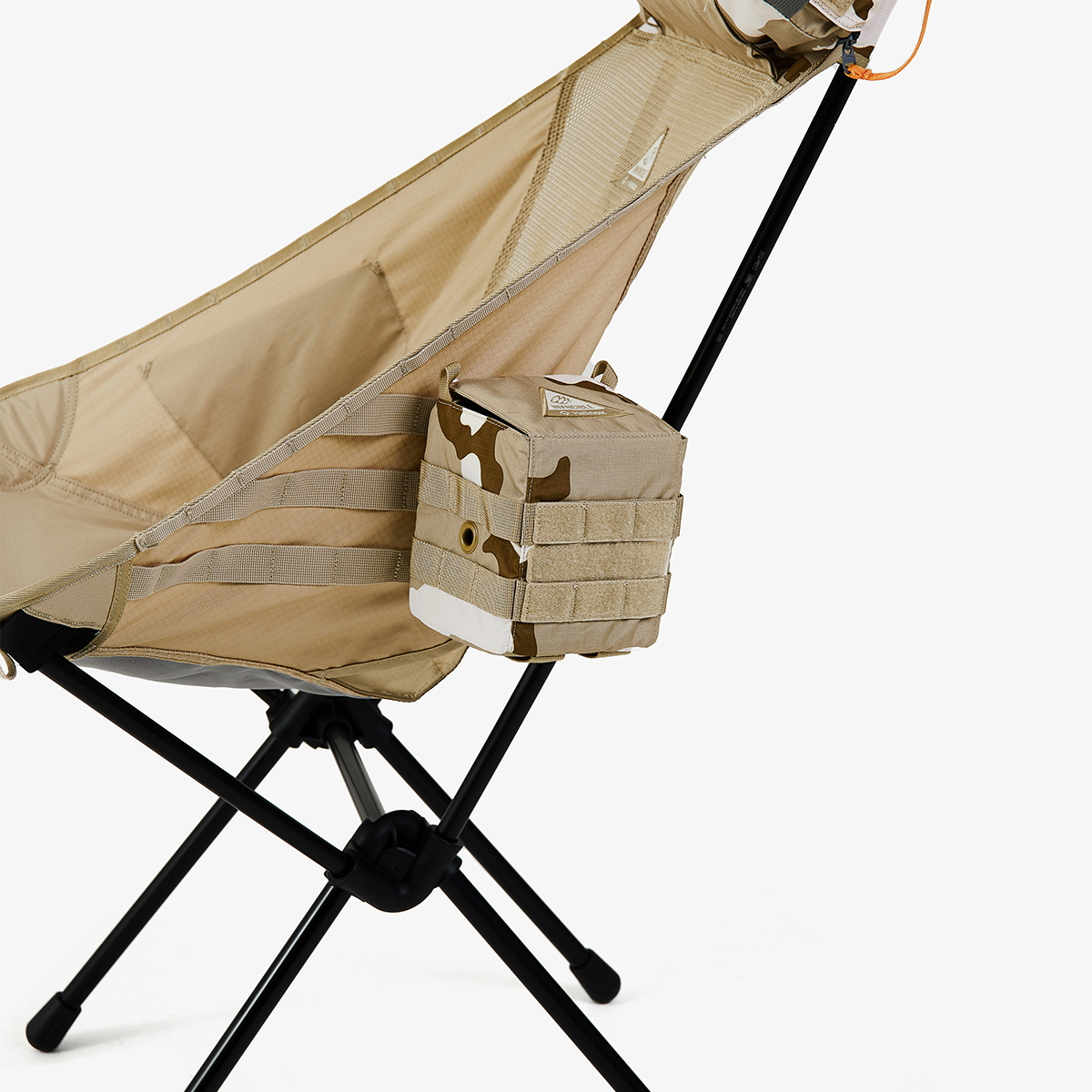 輕量高腳椅結合沙漠迷彩設計,極度輕量化,快速收納與組合設計 · 極佳人體工學設計,左側搭載 Molle 外掛織帶系統可自由組合配件,