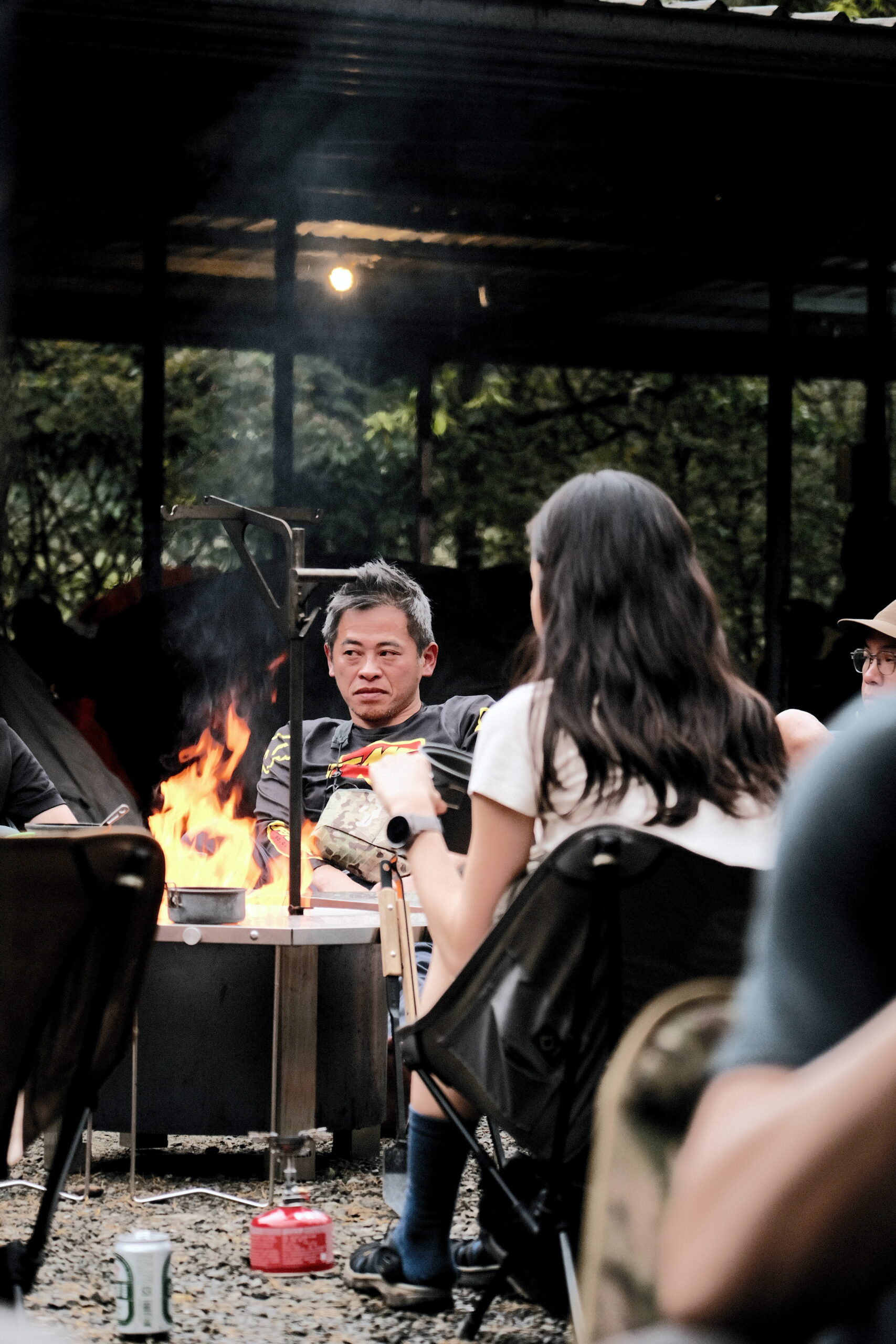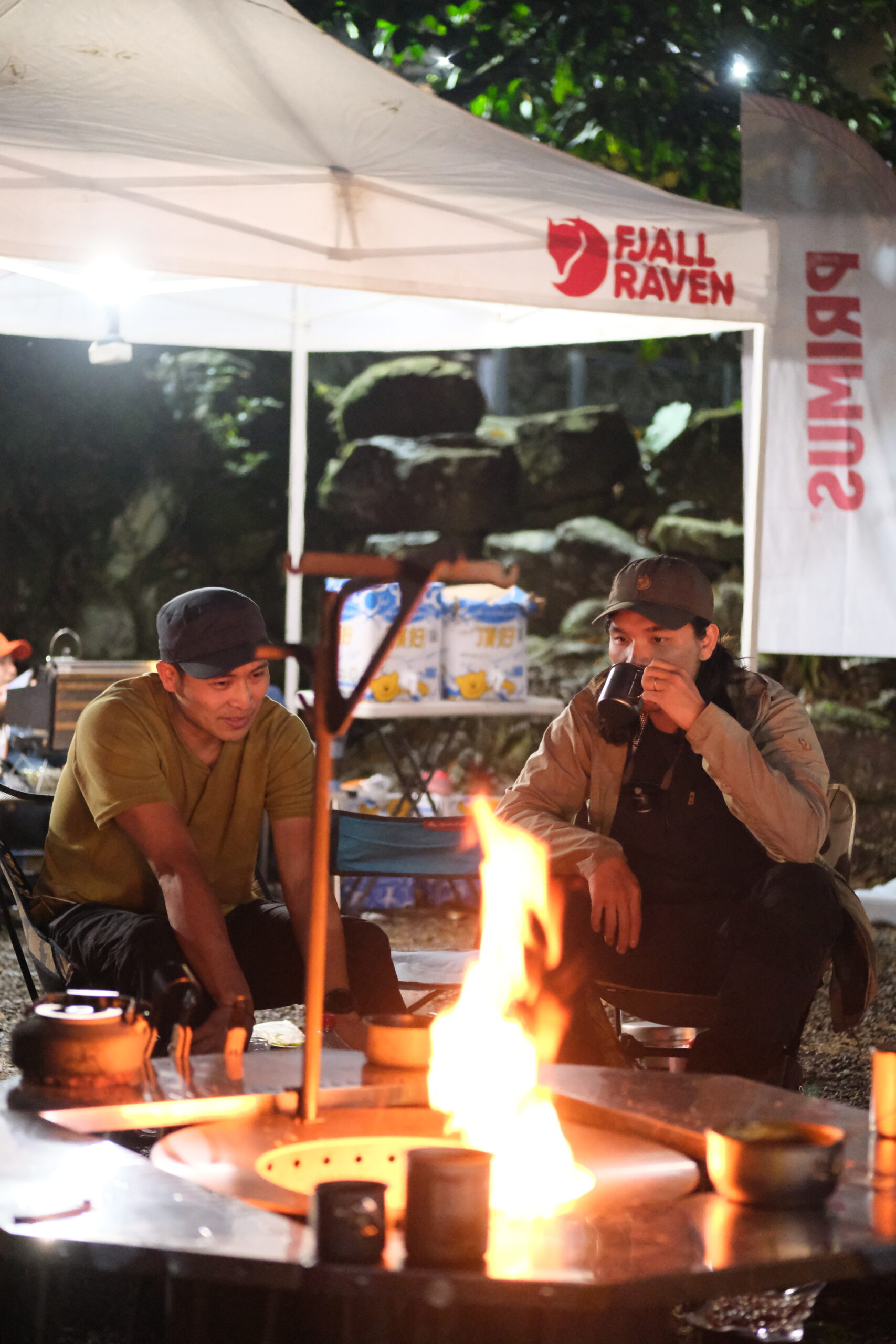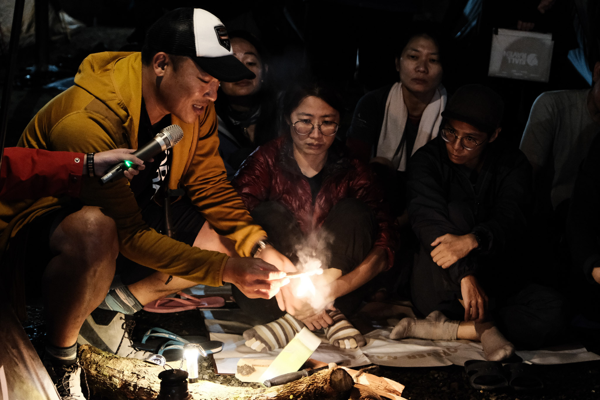 Fjällräven Taiwan 邀請同為來自瑞典的百年刀具品牌 Morakniv 台灣代表,與會分享刀具生火的野外運用,並安排了手作體驗活動,頓時刀具與打火石摩擦的聲響此起彼落,而另一旁正在專心雕刻打磨湯匙的人們,則沈浸在自己的世界裡,這晚寂靜與熱鬧的氛圍,在同個場域裡,形成了強烈對比,天氣也逐漸明朗,依稀能可見零星微光相伴入夢。