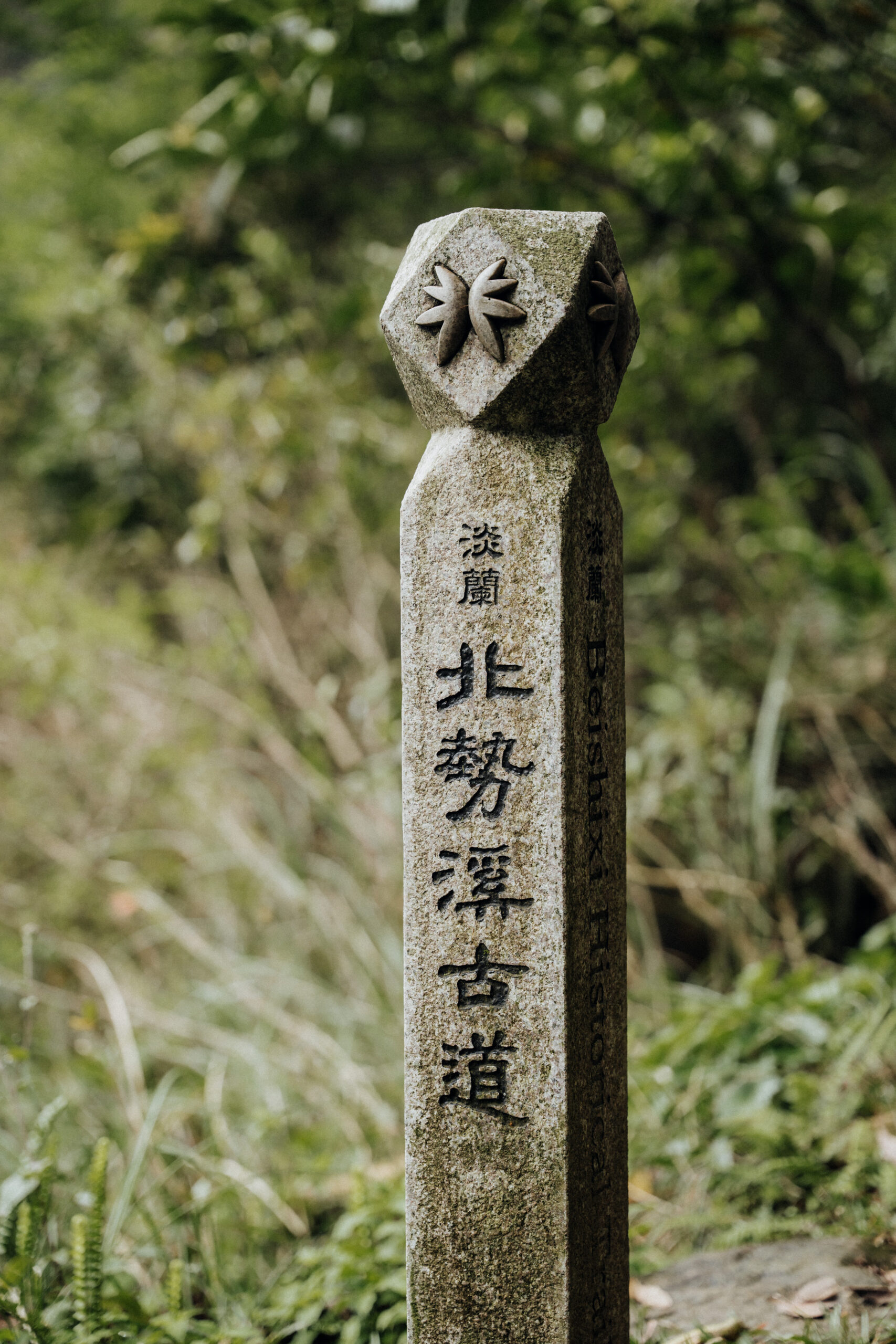 ▲ 淡蘭古道的石碑上,皆有蕭青陽大師為這座國家級綠道所設計的雙扇蕨標誌;北勢溪古道迎接我們的是亞熱帶季風氣候獨有的豐富雨林樣貌。