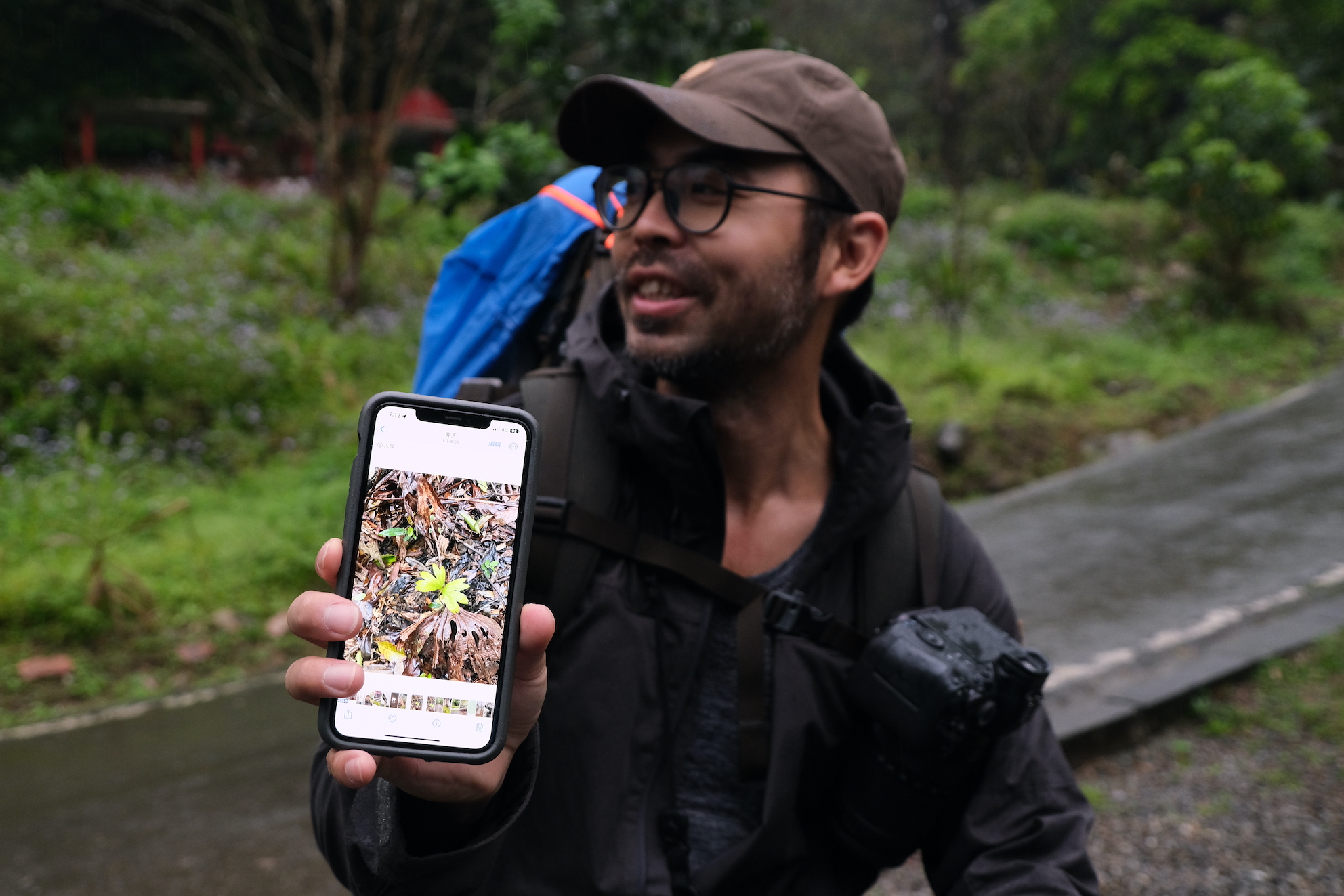 ▲ 一旁的隊友則興高采烈地與我們分享昨日拍攝到的雙扇蕨寶寶,初生的嫩芽頗具春意,雙扇蕨是淡蘭古道極具代表性的植物,它可是從侏羅紀時期生長至今的活化石,蕭青陽大師亦是以之為本創作淡蘭古道的標誌圖樣。