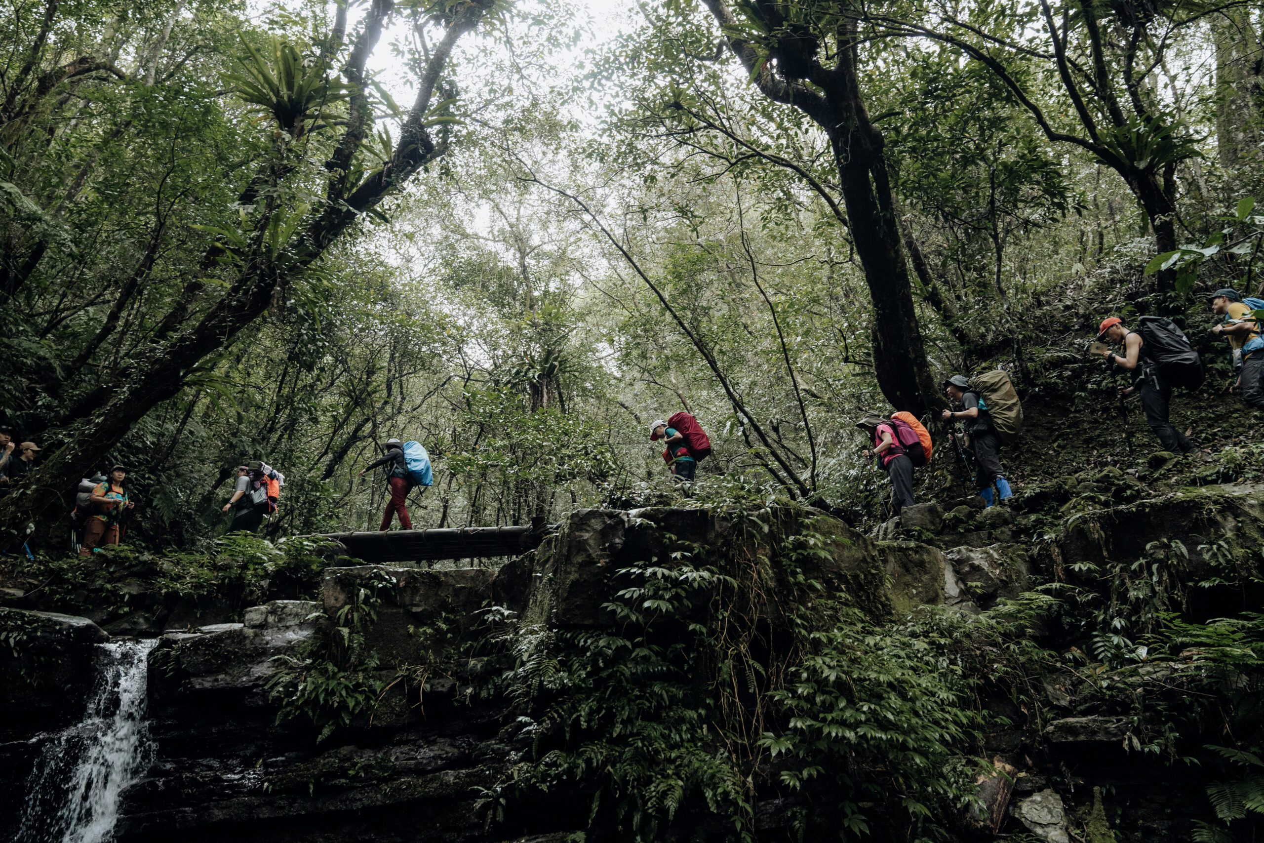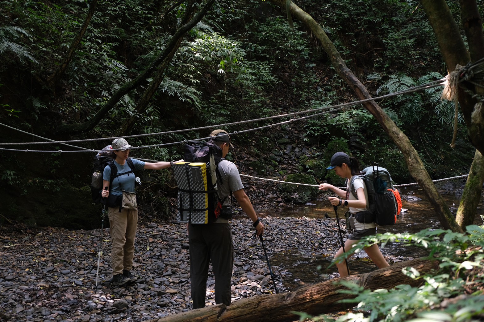 ▲ 其中也不乏需要拉繩,走過倒木的挑戰路段,這段短短不到一小時的路程,竟擁有如此多元地形,令人嘆為觀止,也十足感受 Fjällräven Taiwan 在路線規劃上的用心。