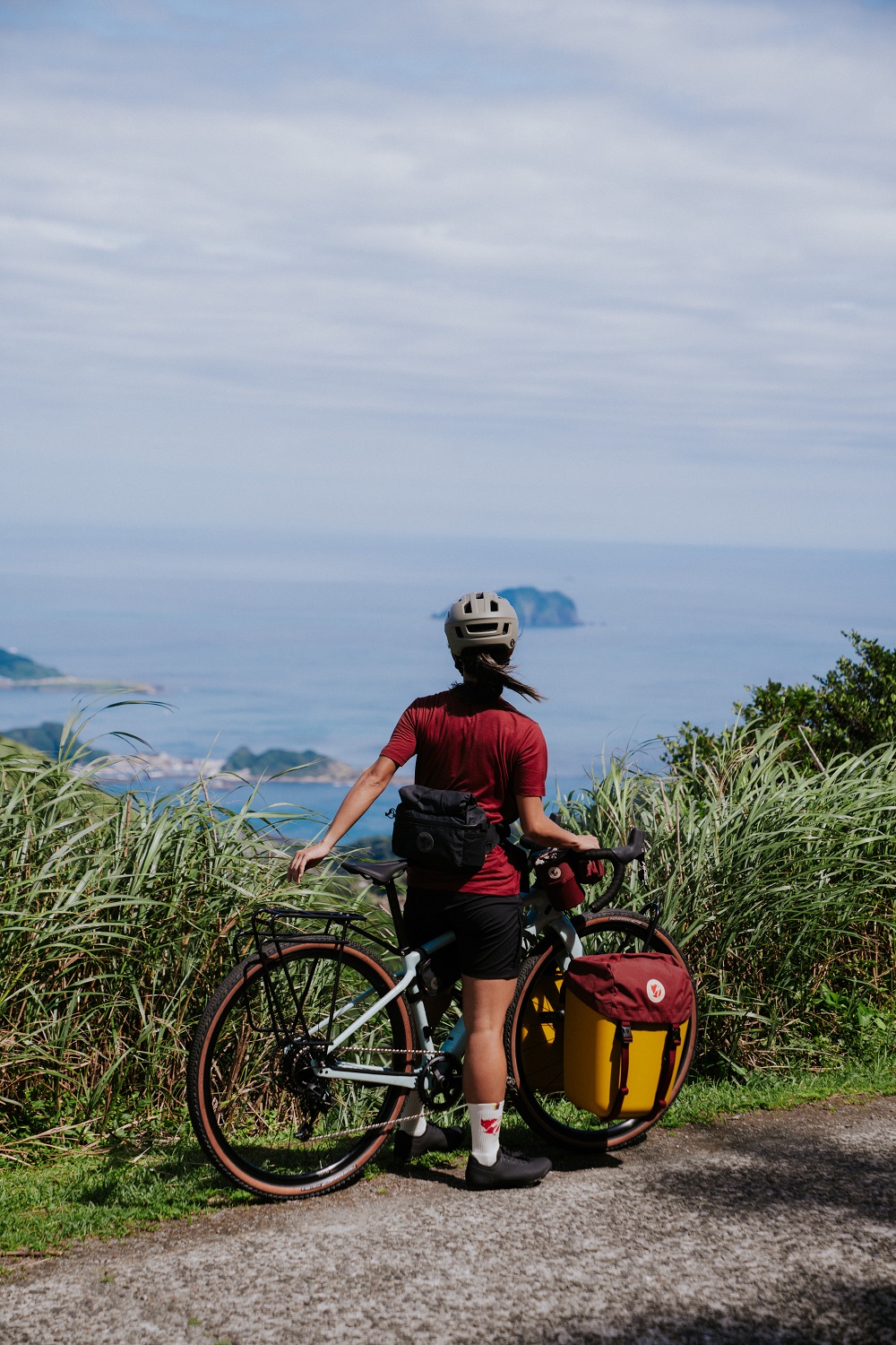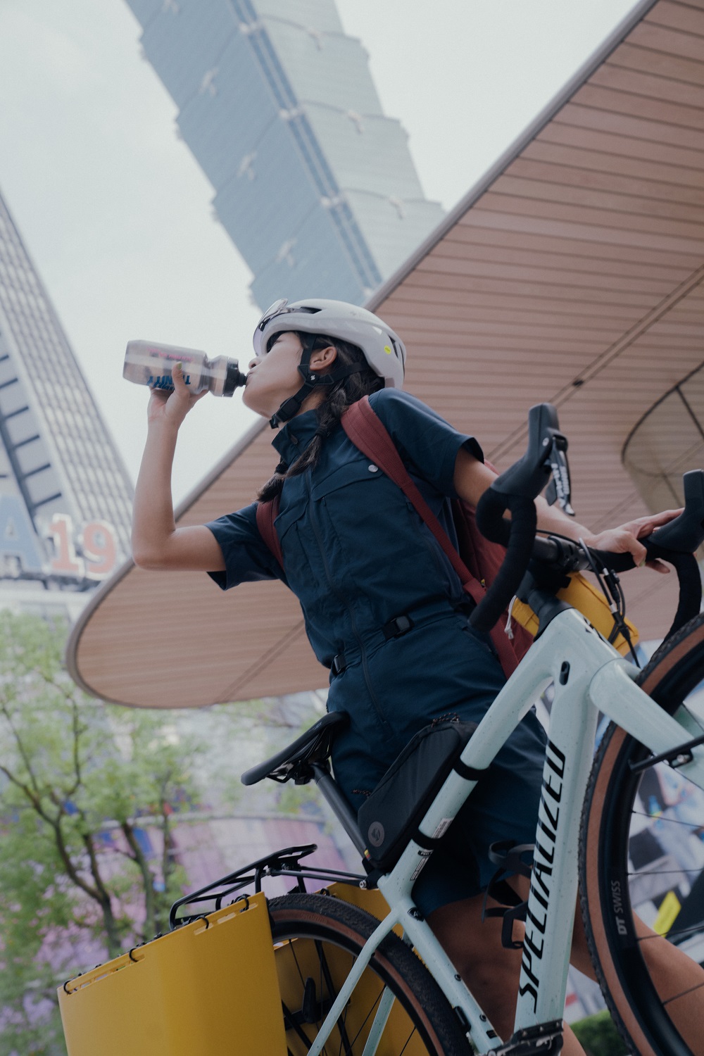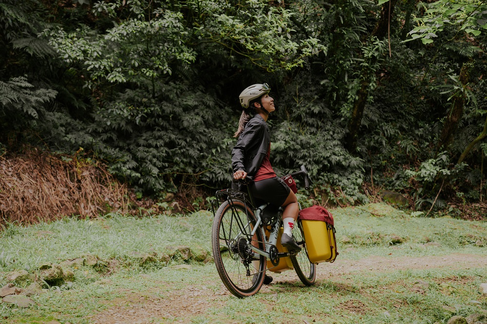 Niwi 說,自己平常騎車出遊時會選擇穿機能性較強的休閒服,「像這次穿的 S/F Sun Field Suit 藍色連身衣,就舒適又有型!」騎車時她通常會戴安全帽,但三鐵跑步項目時或是騎到定點後,就會換戴上帽子,一方面遮陽、一方面「守護」被安全帽壓亂的髮型。她個人還有一個小習慣,身為美國公司商業智能工程師亞洲外派員,為了因應隨時隨地可以工作,她會把電腦放進後背包,騎上單車前往目的地。「所以如果背包有筆電夾層自然很加分。而這個系列的車前袋和可以變背包的腰包,可以因應不同場合有所變化,對我來說非常實用。」她笑說。