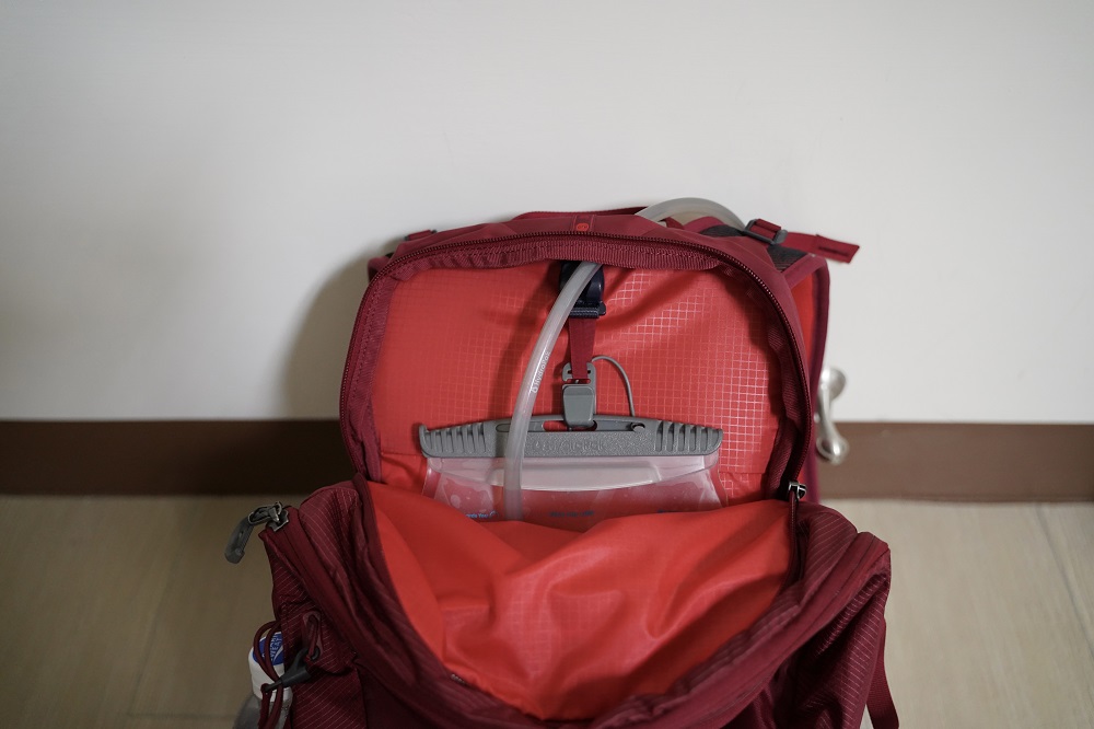 ▲內有水袋倉,水袋掛鉤除了使水袋貼合背部保持背包體的配重外,也能讓水袋保持直立,不會因為倒塌擠壓到出水口,導致水流不出來,水袋倉夾層日常使用也很適合拿來放筆電。