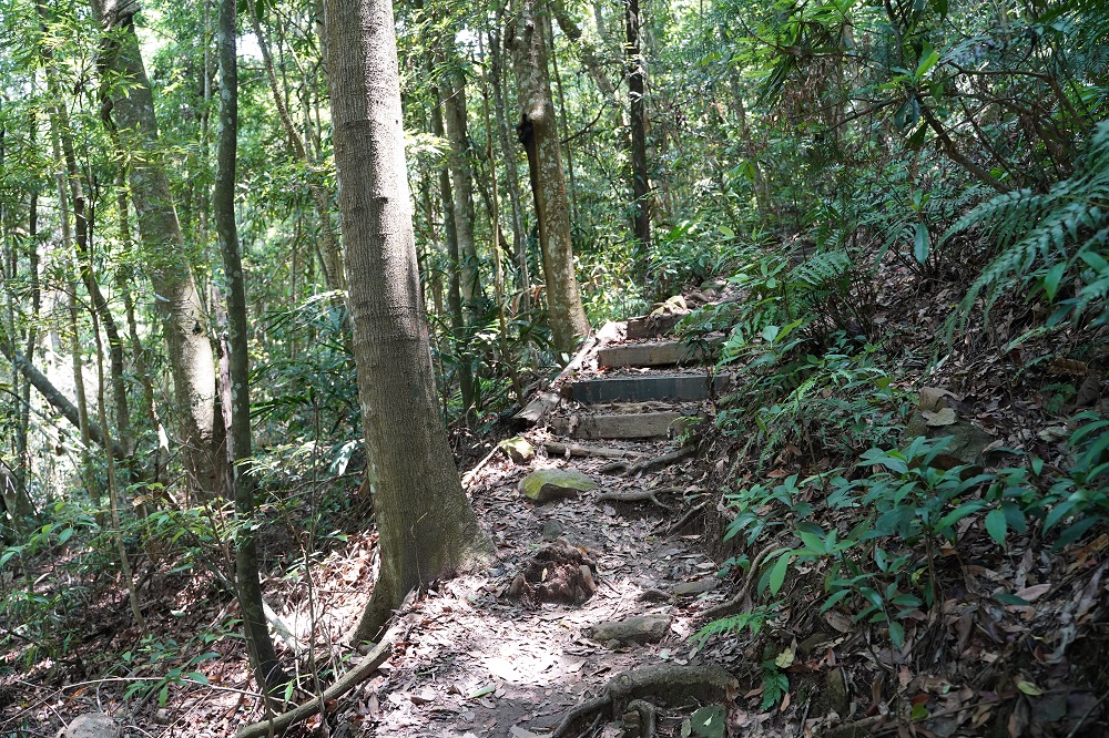 步道是盤根錯節的樹根,有一段是較大的岩石,一旁有繩子可以拉繩輔助,但若地面溼滑則要盡量少踩樹根避免滑倒。