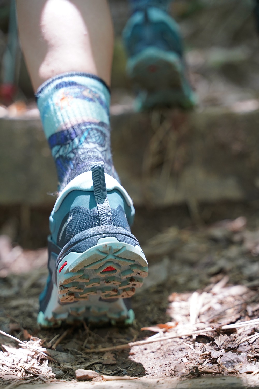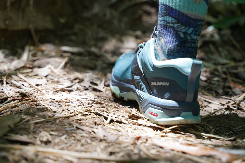 而低筒的優勢則是輕,一隻 X Ultra 4 只有313g,已經逼近部分越野跑鞋,另外沒有腳踝的包覆,動作上可以更靈活。我剛從中筒登山鞋換到低筒登山鞋,有明顯感受到腳踝穩定度不足,容易小翻船或扭到。因此有先穿去野溪溫泉與郊山練習,多爬幾次強化腳踝周圍穩定肌群。至於腳趾向前撞的問題,除了腳踝附近的鞋帶可以拉緊一點外,腳趾稍微向內/向下施力,即可避免下坡腳趾撞到楦頭的問題。