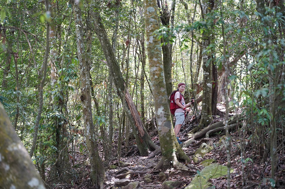 觀景台過後迎來舒適的緩坡,走在樹林裡的寬稜上,終於有陣陣微風從側邊吹來,海拔高度也來到 1200m 左右,氣溫終於不在那麼炎熱。一路緩至 1.5k,約 1300m 才會再次迎來陡上。