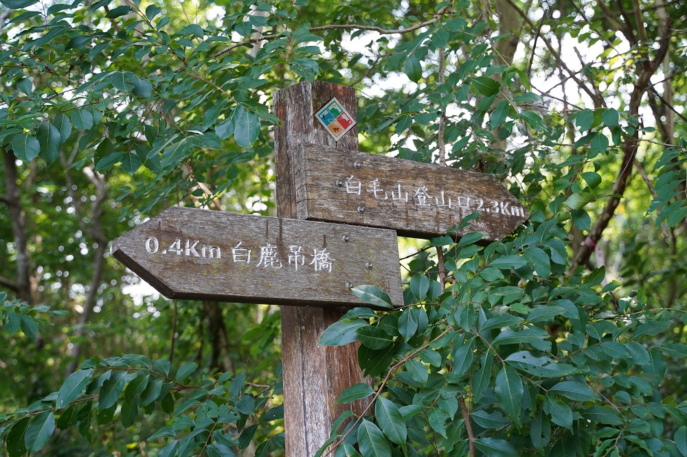 走過長長的白鹿吊橋,能看見許多遊客在此打卡拍照,映入眼簾的是左右兩條岔路,兩條都能抵達登山口,而我選擇距離較短的左側岔路,走不到100公尺就能看見往登山口的指示牌,照著指示右轉進入細瘦的水泥緩坡,四周茂密得翠綠闊葉林,讓人有身處熱帶雨林的錯覺,先是之字上坡再來是緩坡,最後岔路接回寬大的產業道路,這裡一樣選擇左邊的道路,別走錯,往右就會下坡回到白鹿吊橋啦!