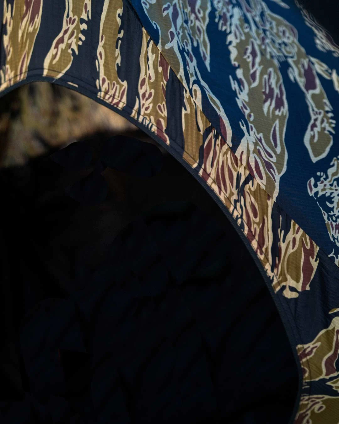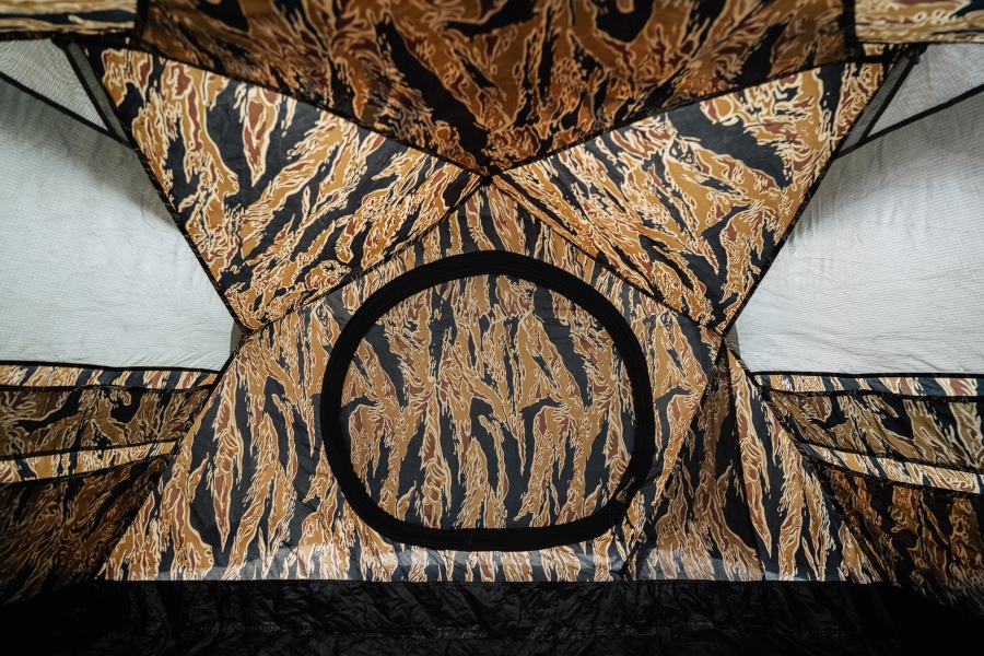 這次受自然啟發產生共鳴的合作,就像是一場比賽,設計師們彼此激盪,讓聯名加乘發揮了各自品牌的經典,不但讓“THE CAVE”提升場地上個性的層次,也讓特種部隊能承受最惡劣的條件的堅毅符號,能透過虎紋,展現在這頂帳篷上,兼具美觀的耐磨,喜歡軍裝風格的朋友,你值得擁有。