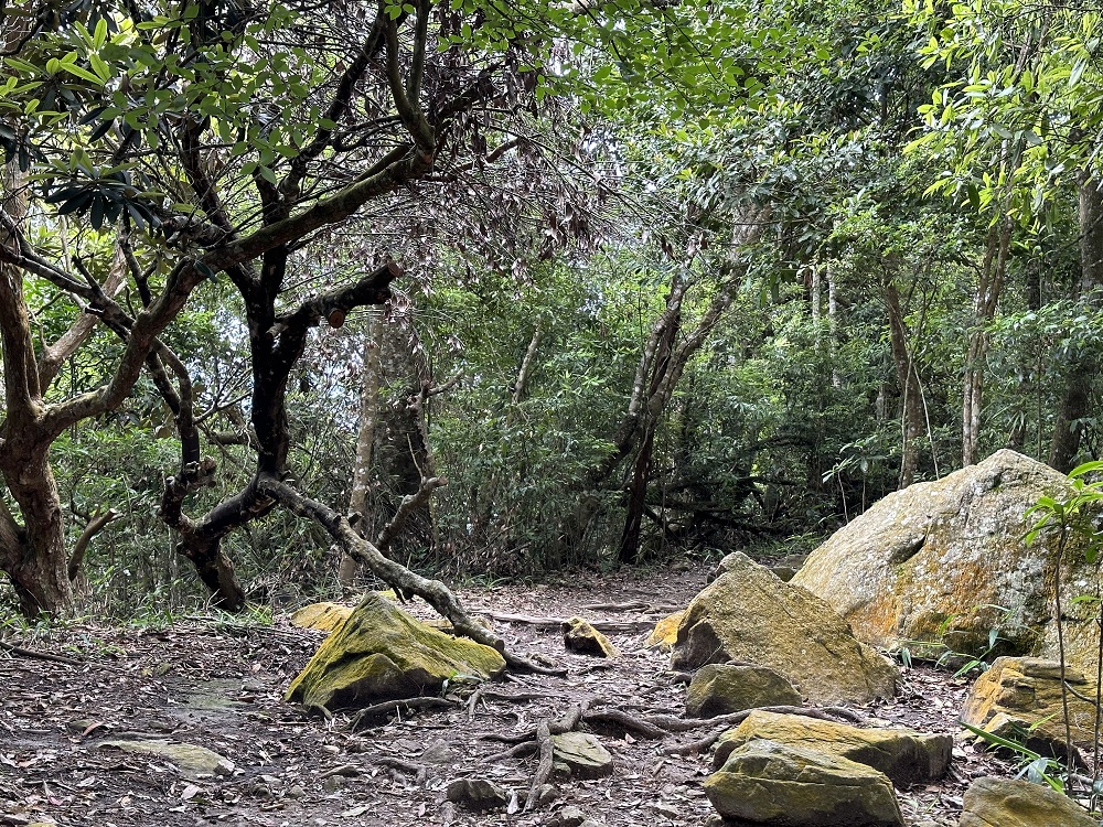 從登山口上來之後,沿途是豐富的闊葉林相。之字型的緩坡大大降低了中級山爬升的痛苦感,剛開始多數是樹根與石塊交錯在地面之間。由於過往是台電的保線道路,所以整體的狀況路況還算良好!目前台電也尚有電塔工程持續進行中,有時候也要注意一下指標與路況指示,偶有架設好的鋁梯需要高遶。