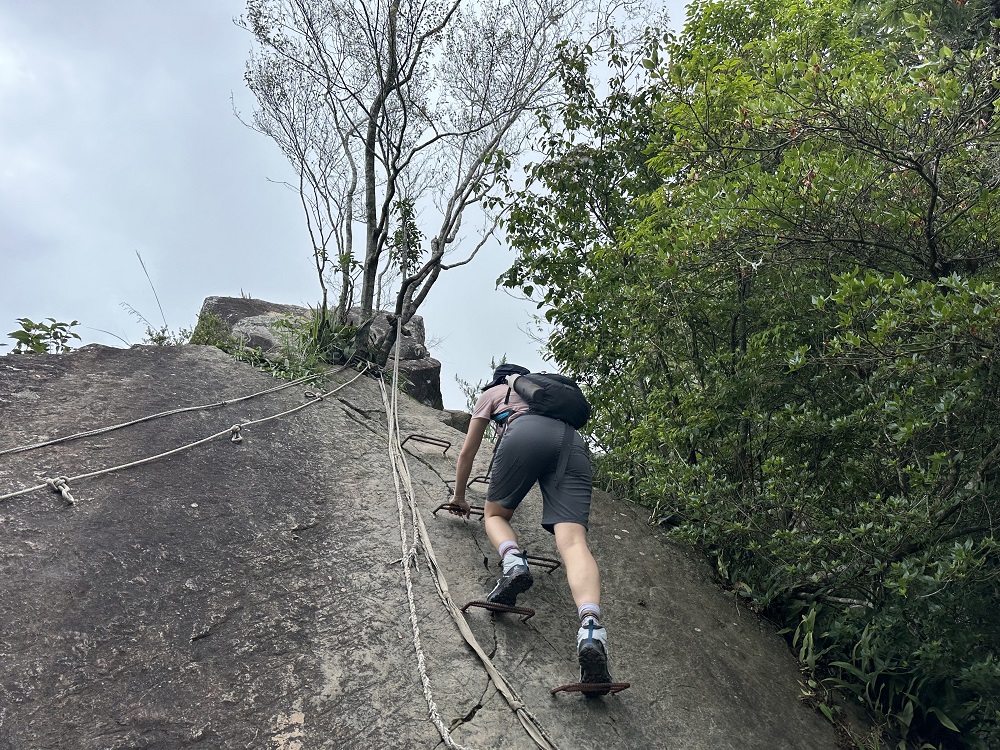 最後經過一段大石區,再向前一些就會看到一小段拉繩區。不過因為岩壁上已經架好穩定的踩點,所以倒是蠻親民的喔!和鳶嘴山、五寮尖的峭壁相比,這段真的算是幼幼班的程度。通過之後,沿著稜線走,穿越一個如同龍貓隧道的場景,東卯山0k的牌子就映入眼前囉!再抬頭往上看,看到上方的電塔、反射板隱隱現身,就即將抵達三角點!