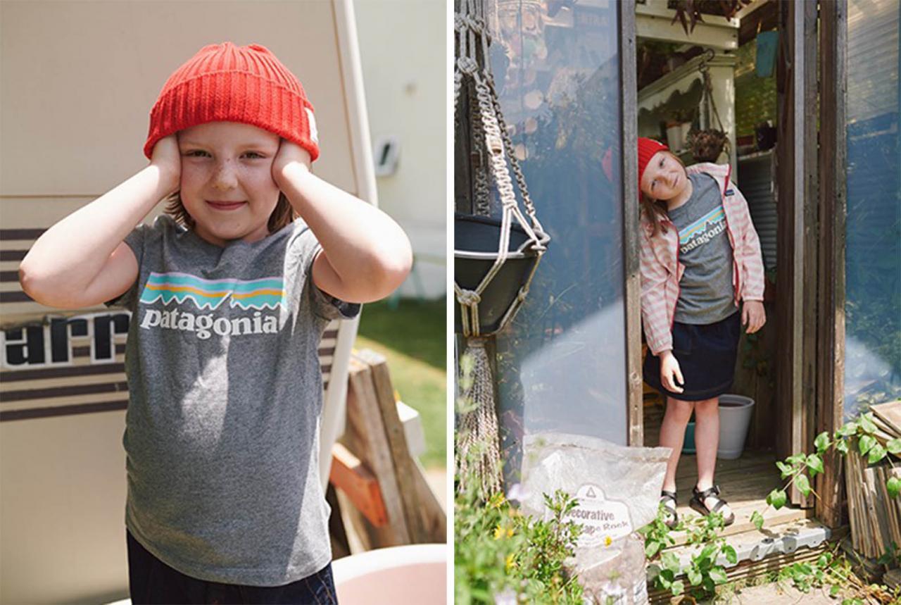 女孩身上的 Patagonia 灰短 T,再搭上橘紅色的毛帽,既舒適又有型,非常合適微涼的秋天。