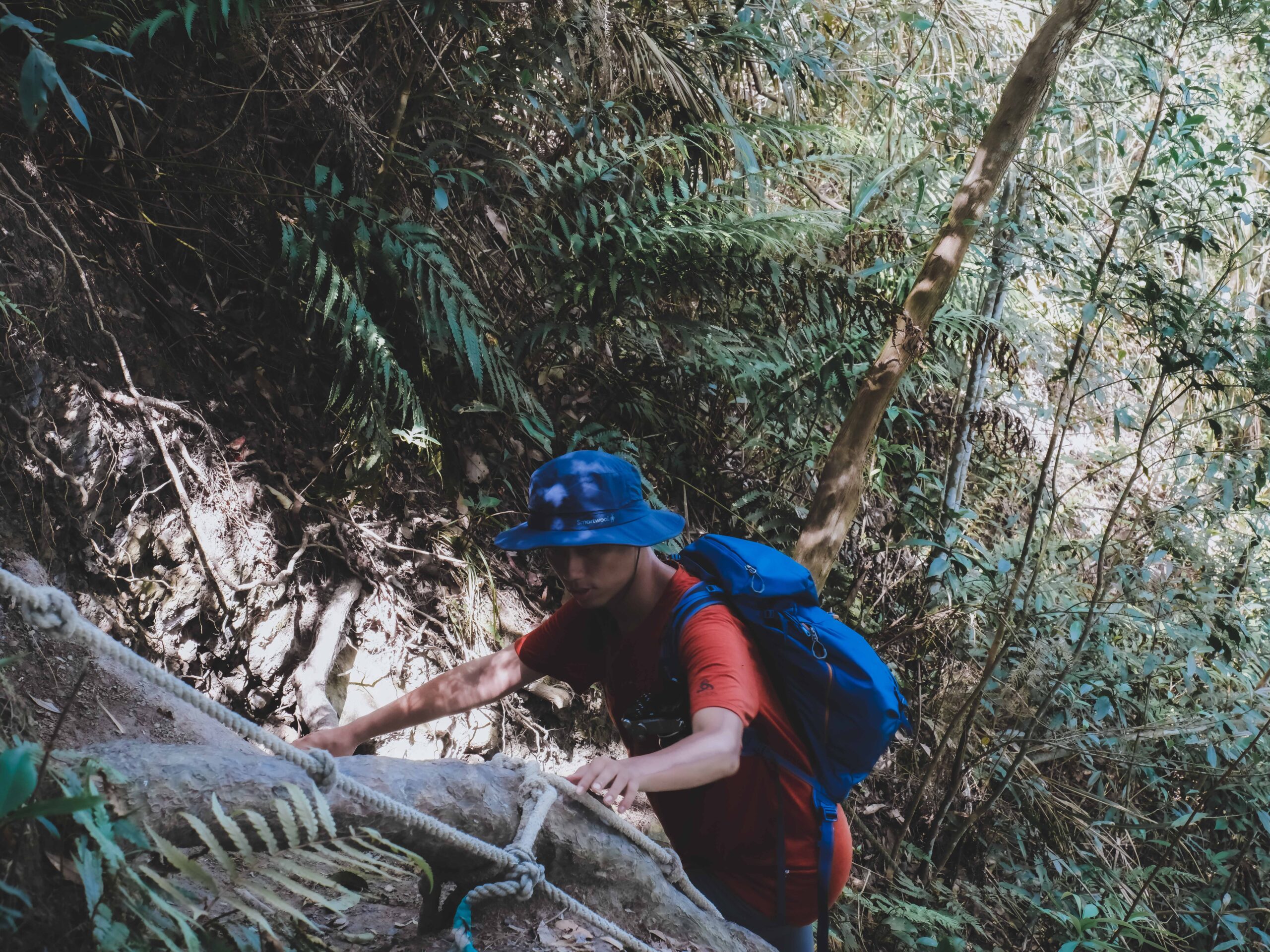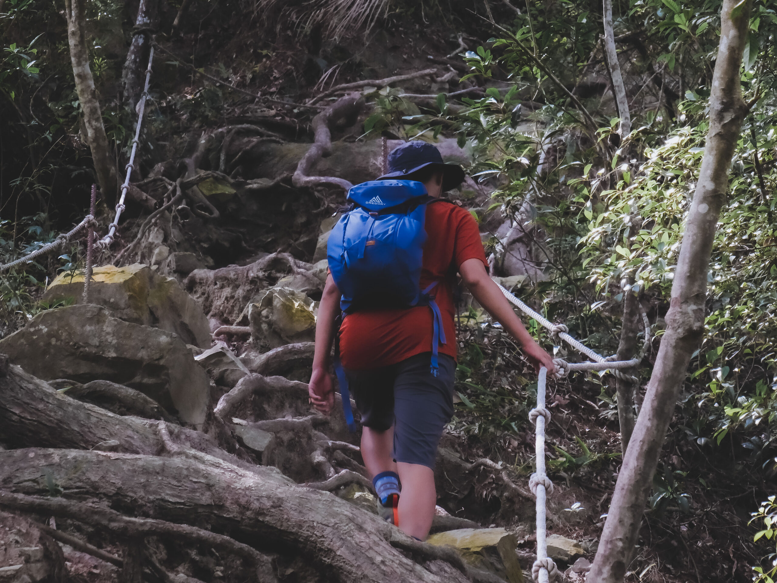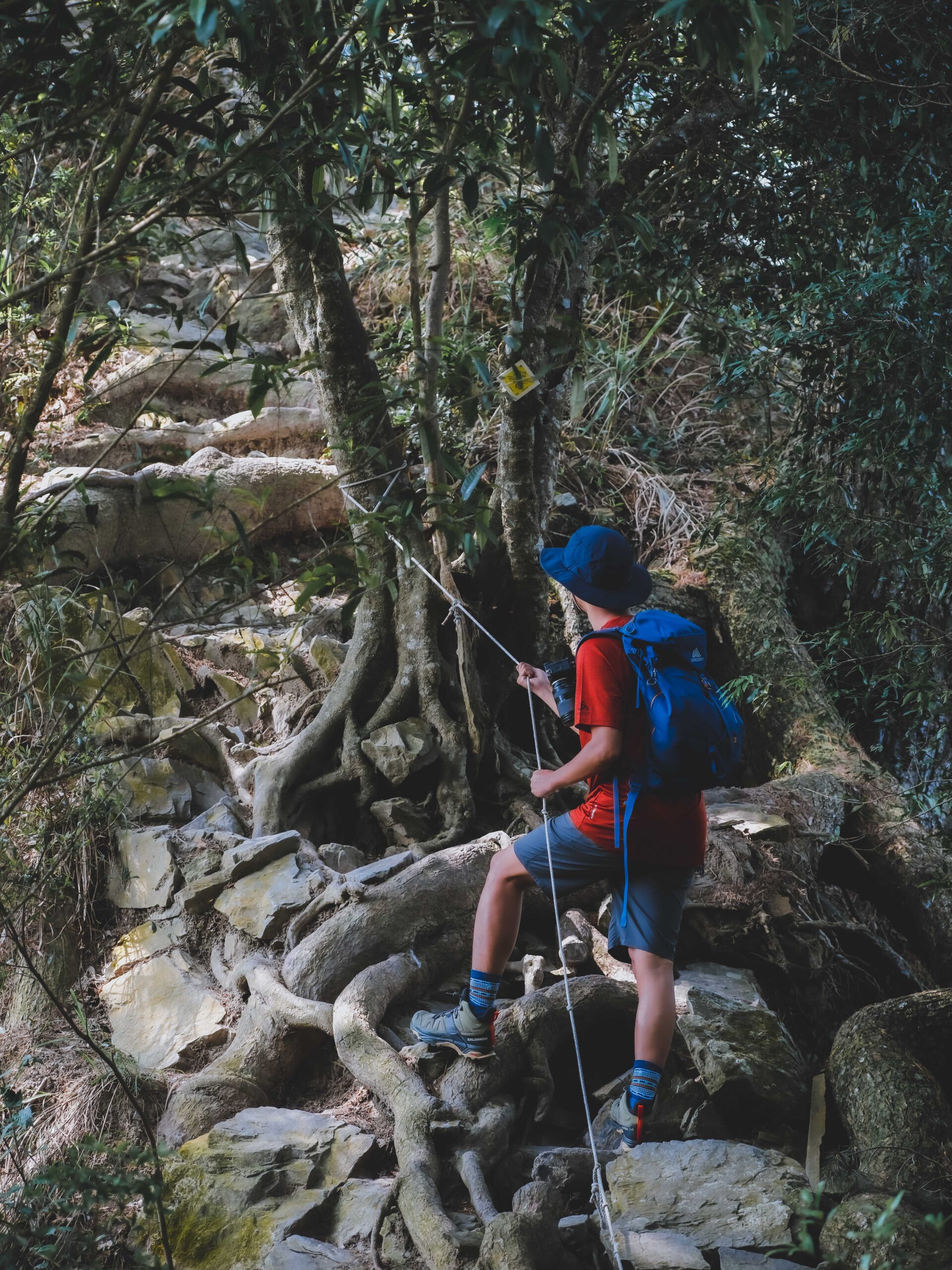 一路上很多路段要靠一些盤根錯節慢慢攀扶而上,這時測試 Salomon X ULTRA 4 它的性能表現均衡,包覆、靈活、抓地、重量、舒適各項都是水準之上,上坡靈活駕馭、下坡安心踏穩,兼具了輕量與防水,有GORE-TEX 防水功能加持,路途中不論經過溪水還是面對下雨天,也都能安心的穿著它繼續行走。