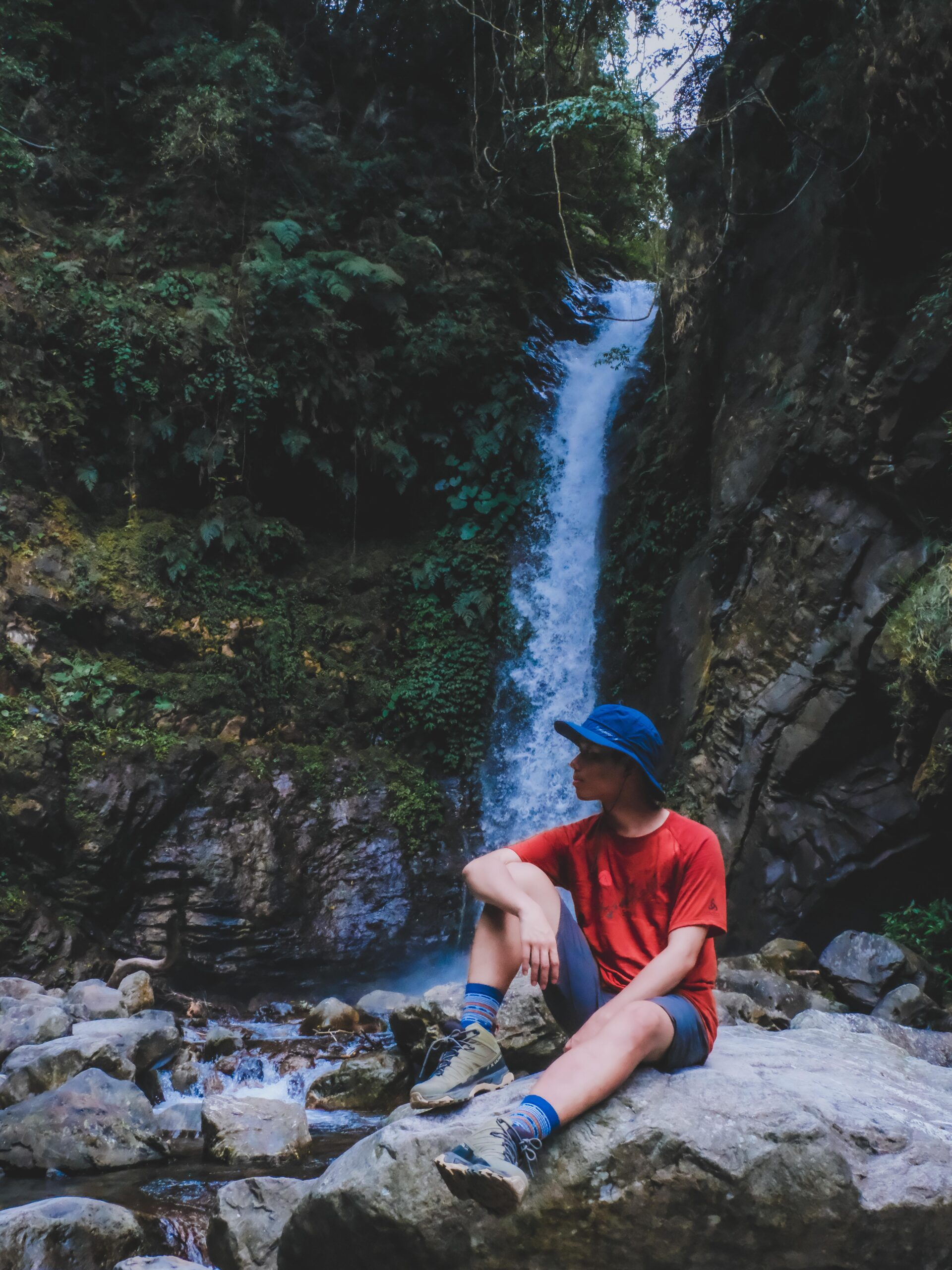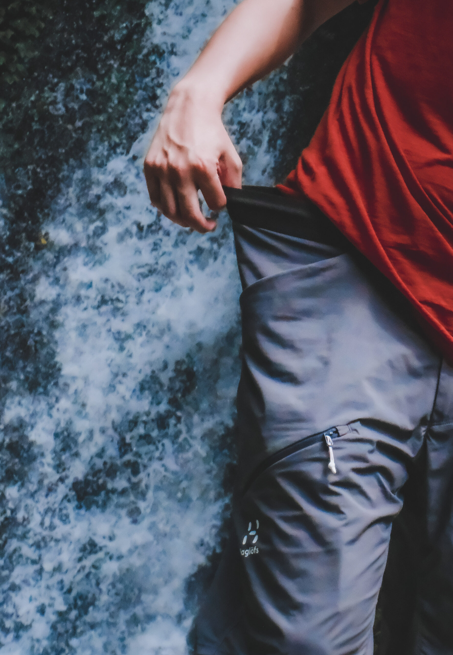 除了三角點以外,唐麻丹山最美的拍攝地點,蝴蝶谷瀑布,絕對不能錯過,從三角點約走 1.2k 就會到達蝴蝶谷岔路,一路下切到蝴蝶谷,一件好穿的短褲就顯得重要,不然有時候下坡時,褲子不夠有彈性就會顯得卡卡,腰部彈性設計結合抽繩,可有更多的調節空間,而且整個穿起來很輕盈也很耐髒,在夏天使用完全沒有悶熱感。