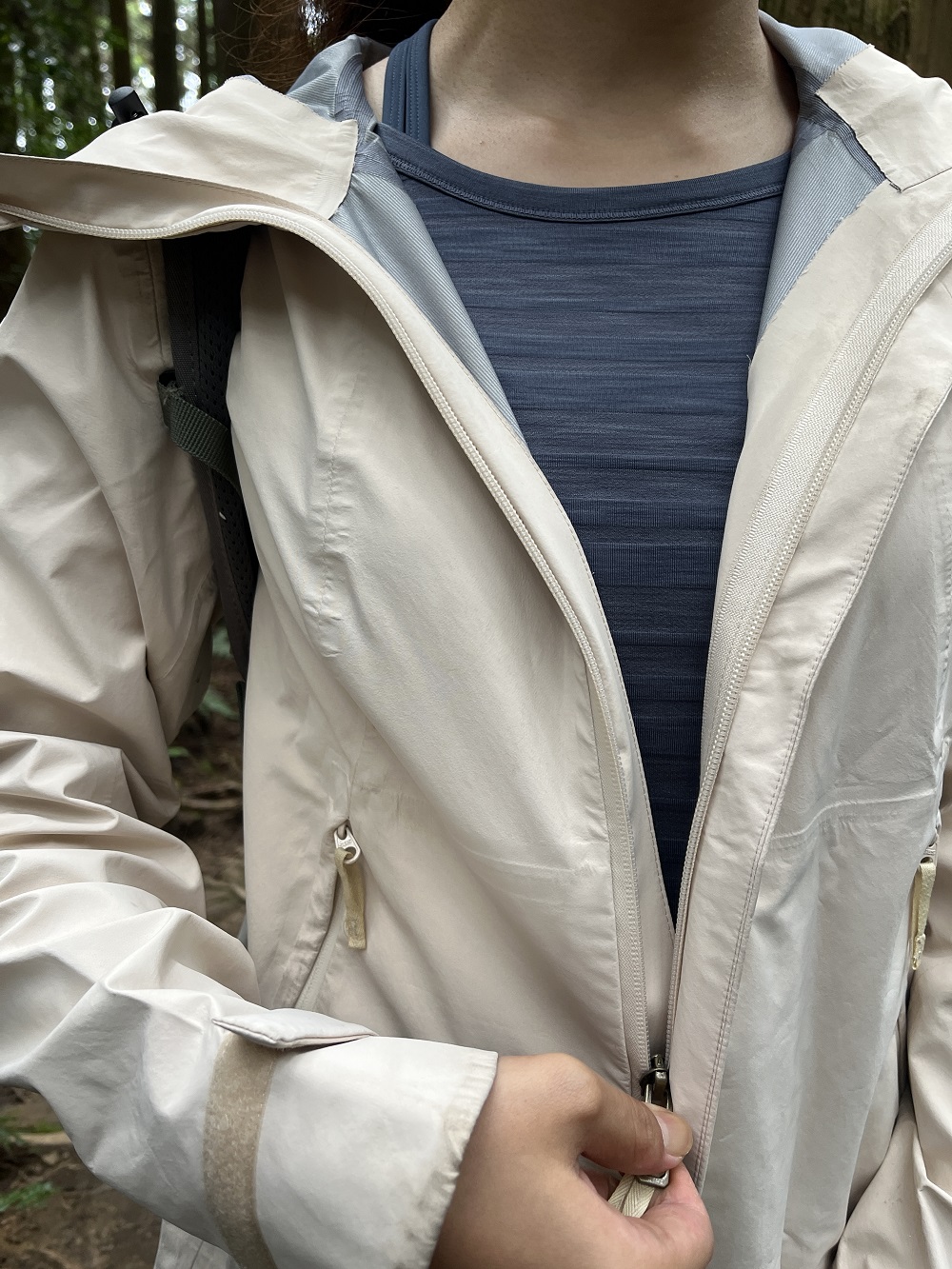 下午兩點左右,果真來了一場又急又猛的午後雷陣雨,趕緊套上登山風雨衣。內搭在風雨衣裡,透氣度依然不錯,較長的袖口設計能防止皮膚和較硬的風雨衣直接接觸摩擦,這個特點在這時候又更加突出。