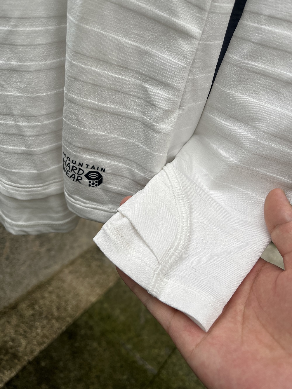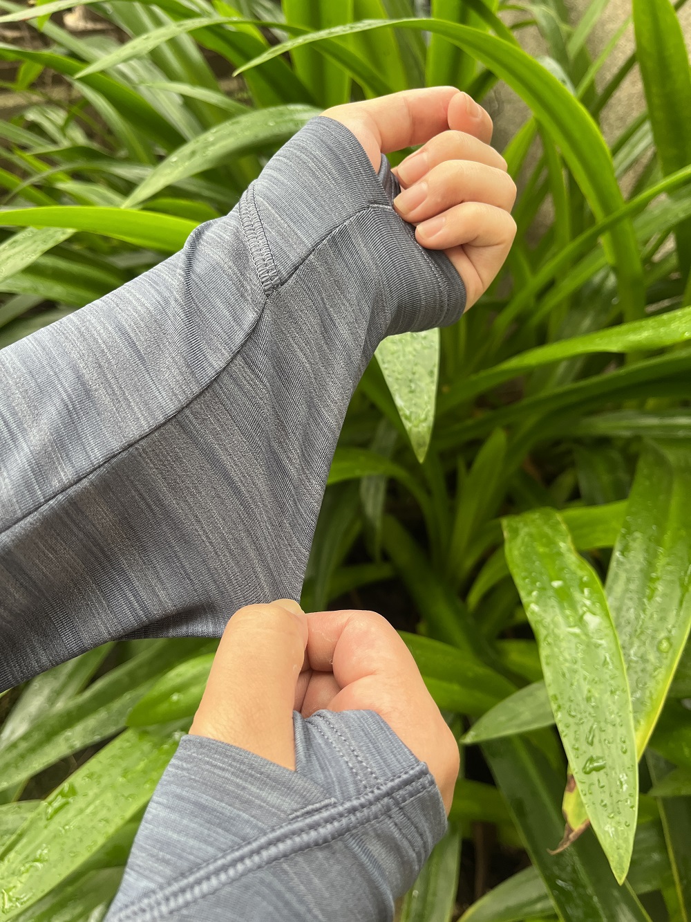 經常上山的我,防曬的時候常忘記手背,結果因為長時間被太陽曝曬而特別黝黑。這件底層衣在袖口的部分採拇指扣設計,可以選擇一般穿法,或是將拇指穿進洞口中,除了可以防止因為動作而滑動,也能夠提供手背多一層保護,避免因為長時間握登山杖行走而被太陽直射曬傷。