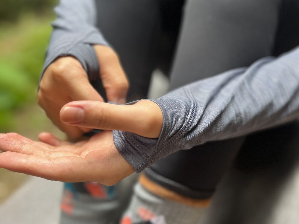 在袖口的部分採拇指扣設計,天氣熱時可以選擇一般穿法,甚至將袖口拉高一些;天冷或是風大的時候,將拇指穿進洞口中,可以減少冷風灌入身體與皮膚的縫隙,或者因為動作而滑動。除此之外,也能夠提供手背多一層保護,避免因為長時間握登山杖行走而被太陽直射曬傷。