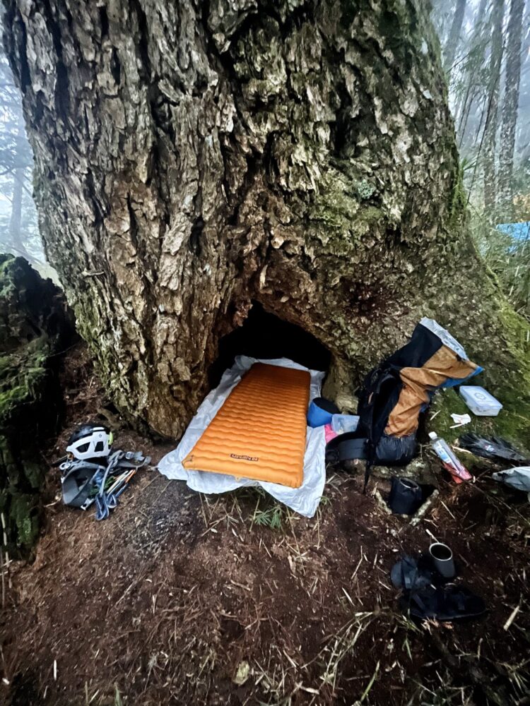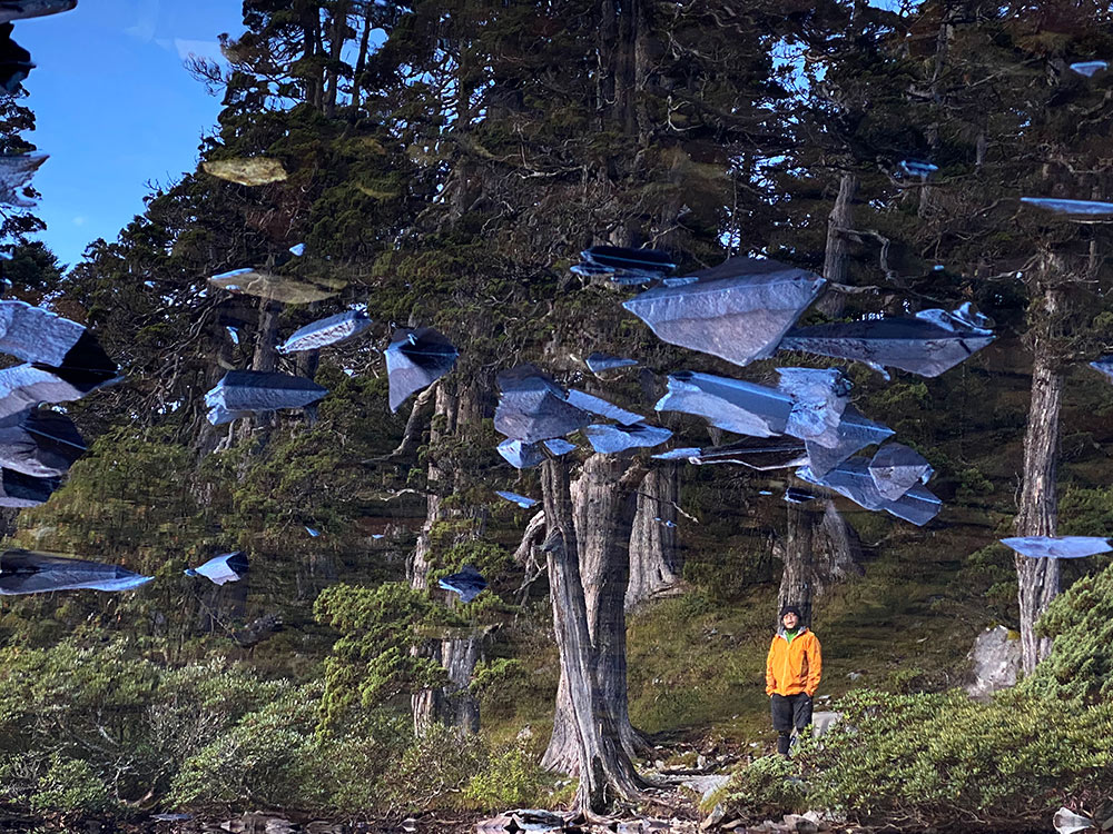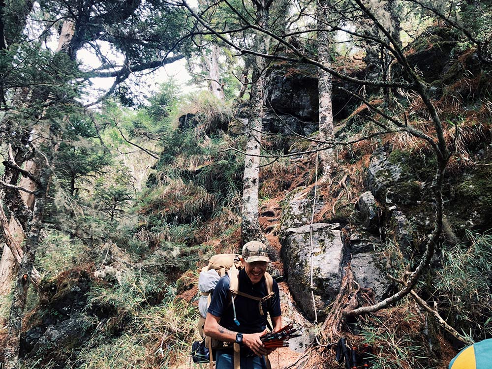 沈導說到山,忍不住說起他前一個禮拜上山的情況:「上禮拜跟朋友從夫布爾溪溯登喀拉業下扁柏神殿,途中突然下大雨而且有夥伴體力耗盡,所以迫降在一片箭竹和鐵杉的混合林。我當時看到有個大樹洞就鑽進去,割了一堆箭竹舖一舖就睡,就果整晚外面下大雨,樹洞下小雨,而且我們全隊被不知名的小蟲咬得渾身奇癢,甚至下山好幾天都消不掉跑去看醫師。那晚後來我跟領隊說,這是我爬山第一次感覺心志被消磨殆盡,太折磨了。」