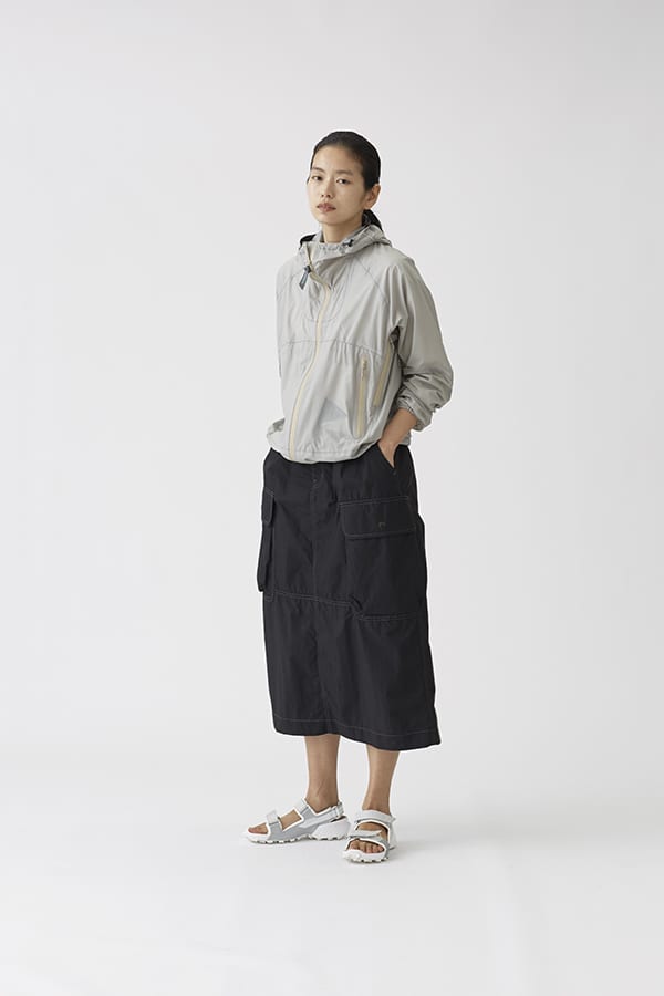 ▲(左)外套:3L UL rain jacket ¥48,40、裙子:CORDURA rip mix skirt ¥29,700 / (右)襯衫:CORDURA typewriter long shirt ¥30,800、褲子:Ny taffeta hiker pants ¥27,500