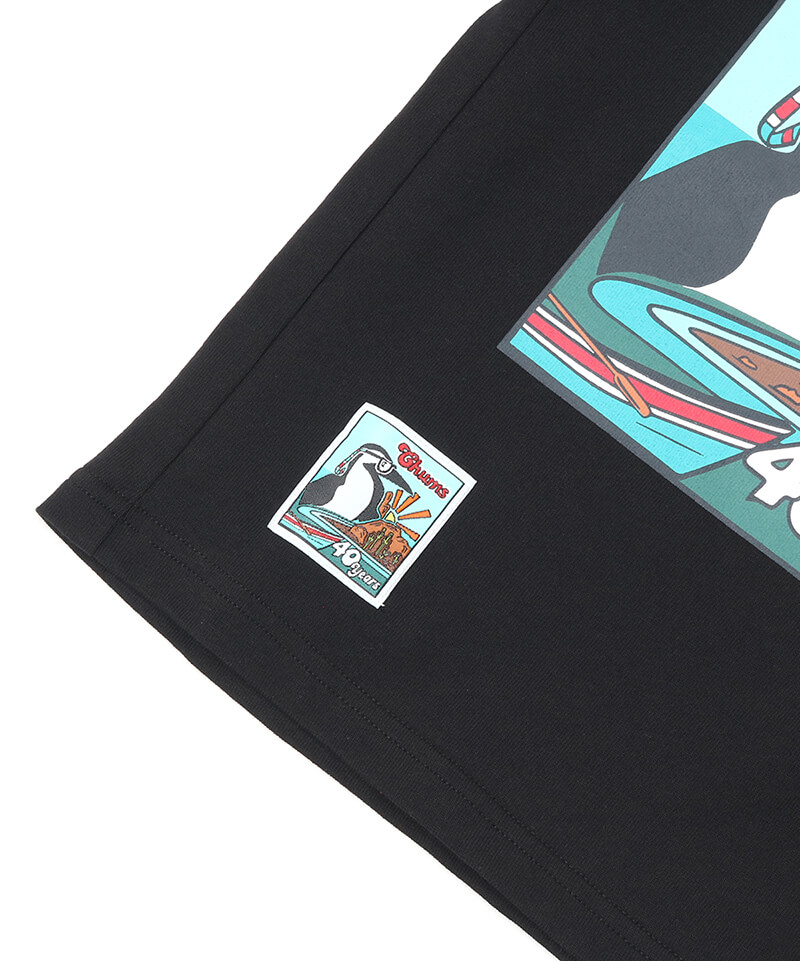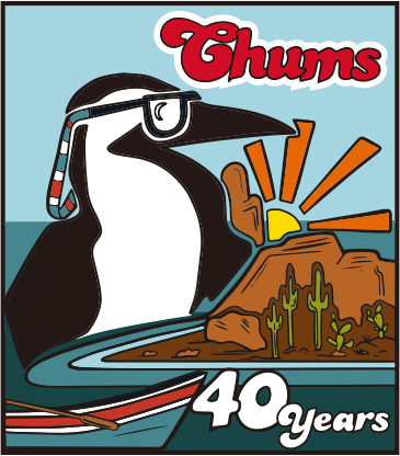 將品牌誕生故事作為40週年的主視覺,就連眼鏡固定帶的細節也一併繪出,Chums 不只將此 Logo 印上T-Shirt,更做成紀念標籤,提升了精緻度,縫製在各種週年商品如:帽子、隨身小包包上,也推出兒童款的 T- Shirt,讓親子露營多了一個穿搭的樂趣。