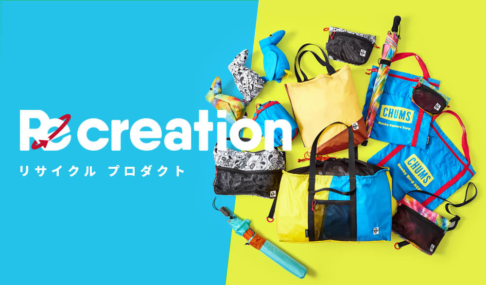 除了紀念商品外,今年 Chums 更響應近年的環保意識,推出 Re creation 回收再創造的系列產品,將回收或是無法再販售的帳篷布料進行重組、設計,推出休閒背包、晴雨傘、側背包、Booby Bird 玩偶等產品,材質皆延續帳篷本身優異防水性及輕量的特色,更保留原帳篷的車縫痕跡,讓每個商品都是獨一無二。