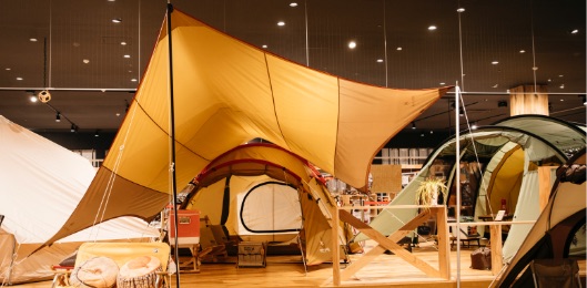 ▲ 趣味的篝火造景和草皮、帳篷搭建起的空間,讓顧客在選擇的戶外伙伴(裝備)的同時,就像開展了戶外生活就第一步。