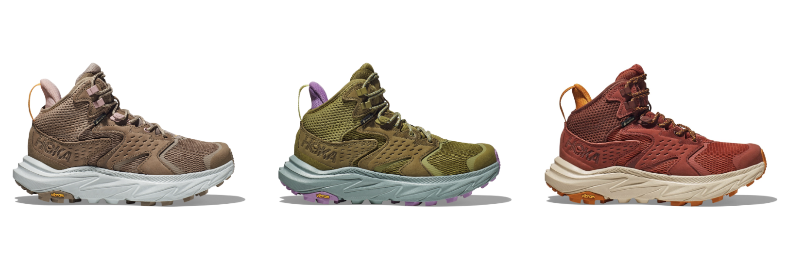 ▲ HOKA Anacapa 2 Mid GTX 中筒登山鞋女款,定價 NT$7,480,沙丘黃/冰河白青、綠色/龍舌蘭綠、紅/流沙色。
