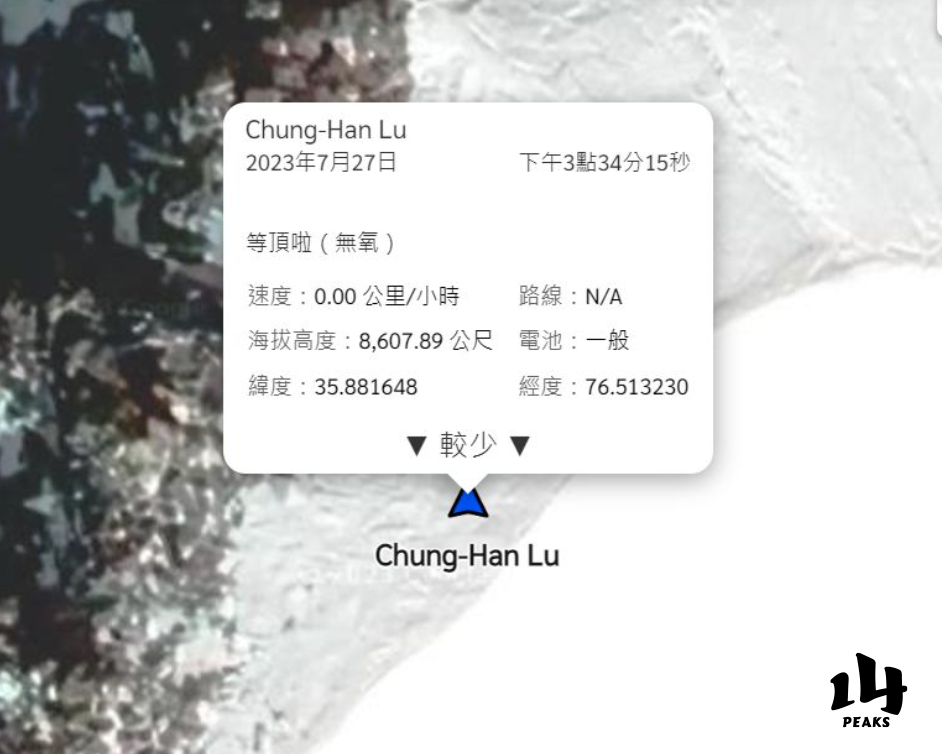 隨著此次登頂成功,呂忠翰也將登山界喻為攀爬風險最大的前五座十四高峰全數KO,無氧挑戰十四峰的目標正式進入下半場。