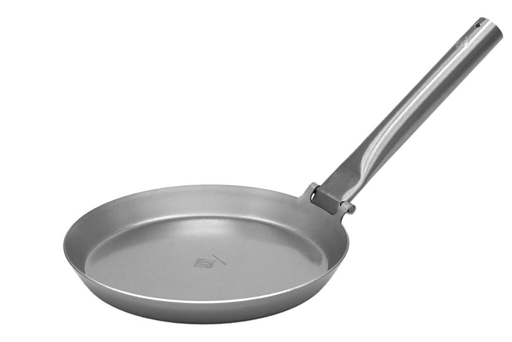 由整塊碳鋼板壓製而成是碳鋼鍋的特色,不僅耐高溫,還具高續熱和高導熱使食物快速均勻受熱,是煎煮肉片的好選擇,而 Stabilotherm 的新型煎鍋是一款可折疊的戶外碳鋼尖鍋,承襲多年的瑞典鑄造技藝,打磨製成,可承受高溫,而碳鋼元素也比鑄鐵輕30%左右,更為輕巧利於攜帶,手柄的部分設計成可以將當地採集的樹棍插入其中,不佔收納空間,但也有配好樺木手柄的碳鋼煎鍋款可供選擇。