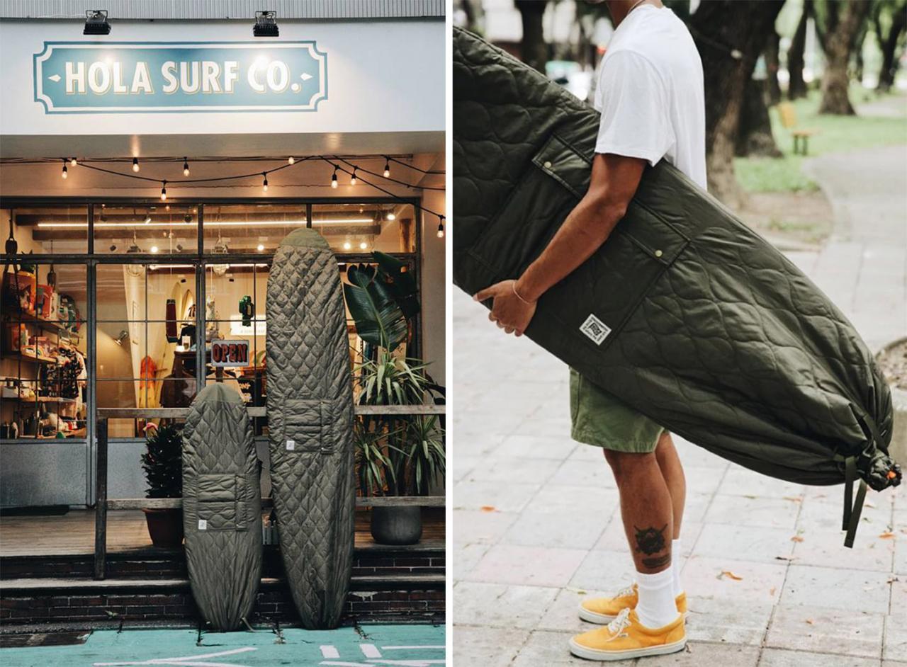 Hola Surf 將衝浪跟喜愛的軍風作結合,品牌推出了軍風板襪,使用美軍 M65 外套內裏 「Army M65 Liner Jacket」 當作設計元素,搭配抗撕裂防潑水布料,內裏鋪棉比一般市售板襪還厚實一些,增加對衝浪板的保護;