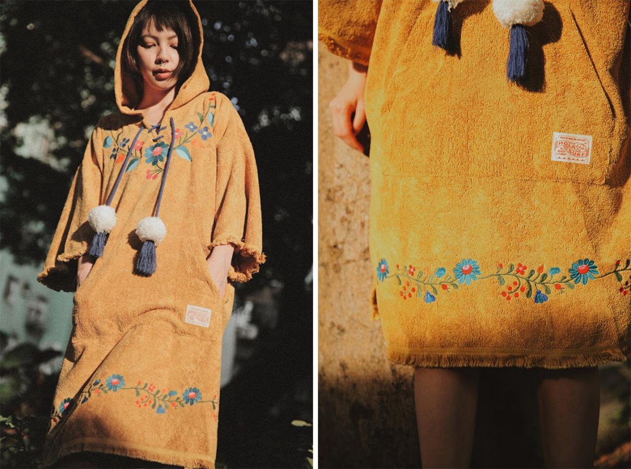 Hola Surf 品牌自行設計的毛巾衣,以整件洋裝的概念與樣式下去設計,搭配刺繡與流蘇,讓毛巾衣不只有上岸的時候穿著,也能當作露營、居家的保暖配件。