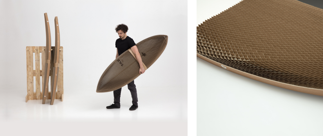 現在澳洲新興衝浪品牌 Flexi-hex 所推出的硬紙板蜂巢板襪,是一個環保又便利的替代方案,100 % 可回收材質再生製成,蜂巢狀的設計可以達到很好的緩衝效果,而且可以一直重複利用,收納起來一長條如燈管形狀,放在家也不佔空間。