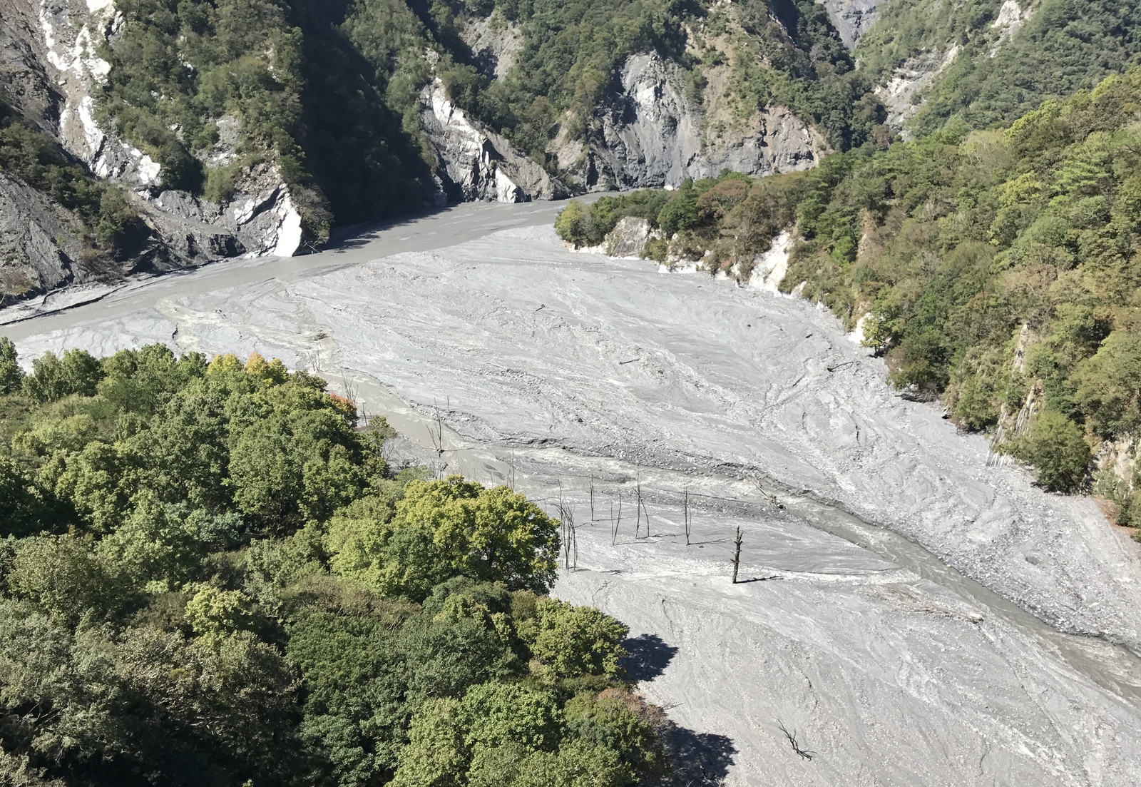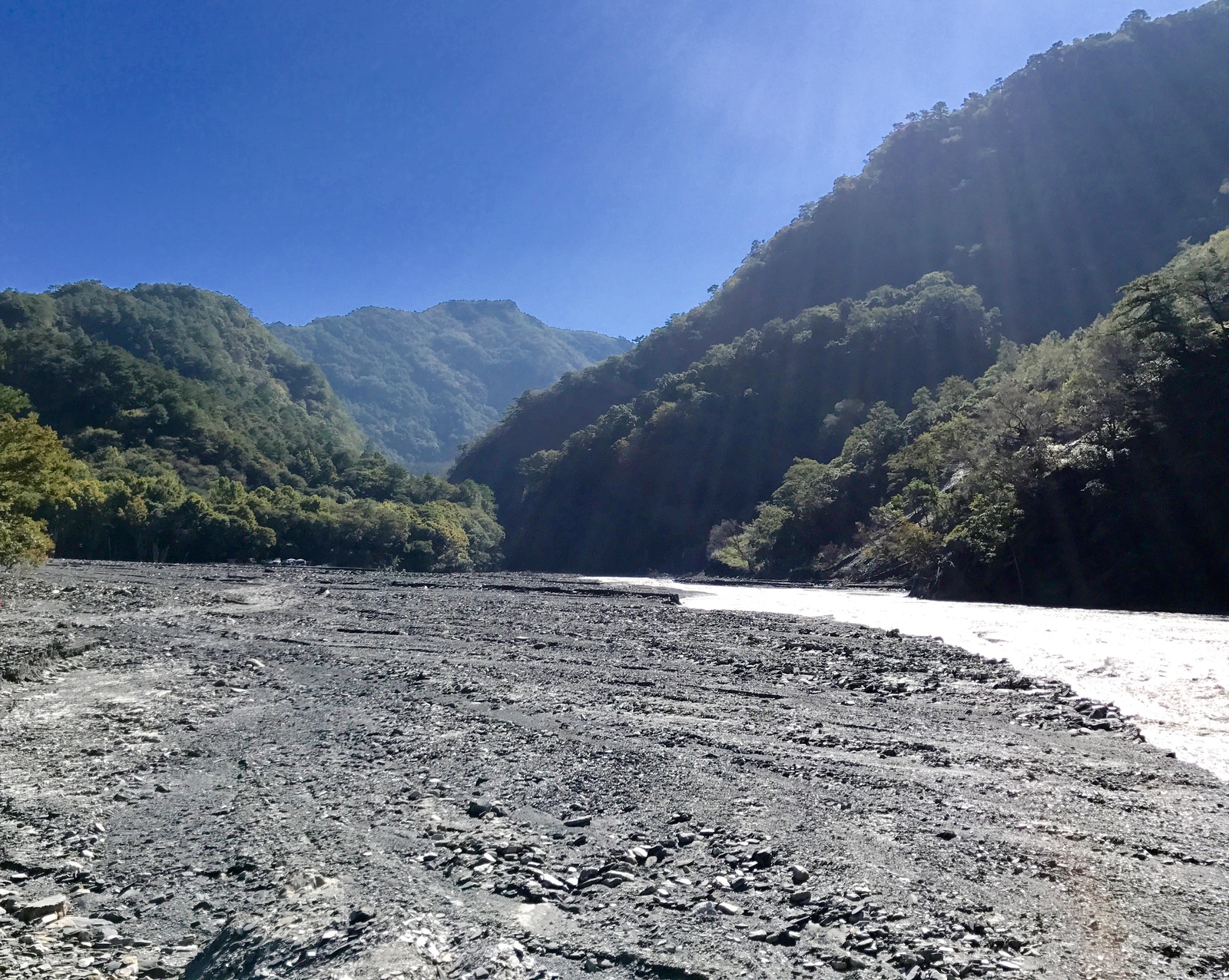 直上山谷,從奧萬大吊橋俯瞰河床,底下盡是一片片的沖積泥沙地,真難想像之前的河床樣貌是怎麼樣的