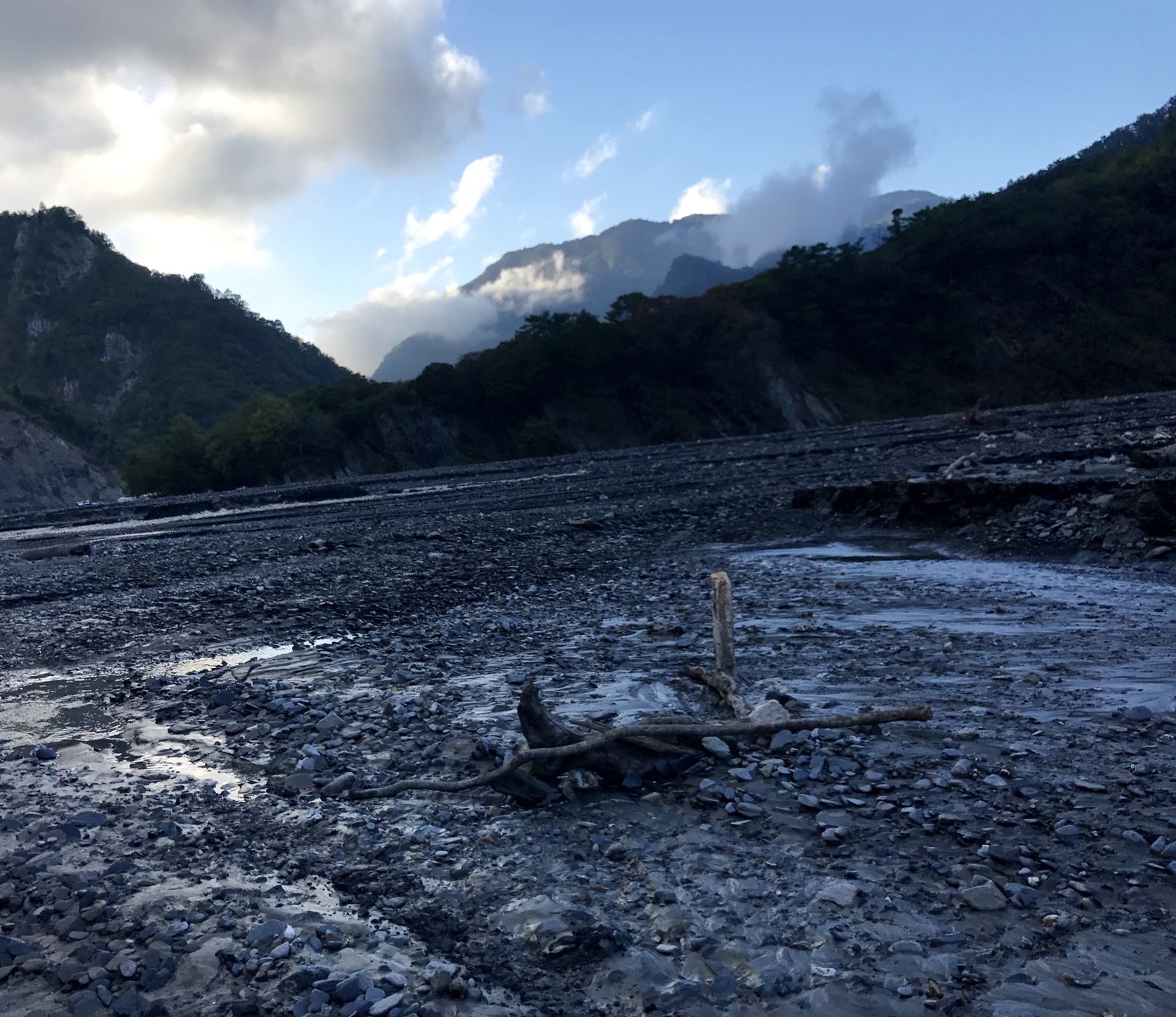 尋找到可以下切的路線後,我們發現一連幾天豪大雨,可以走的路幾乎都被掩蓋住了,一根一根的巨大漂流木,大雨沖下的落石、大小交錯,有的超大顆的就這麼橫躺路中,加上河流黑呀呀一片夾雜著滾滾泥沙,混濁到完全看不到溪底有多深,讓我一度無法呼吸,很想放棄回家睡覺好了!