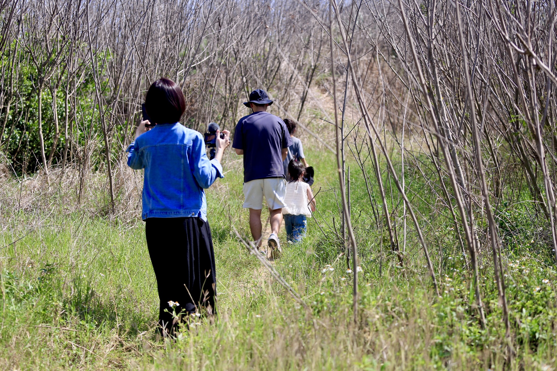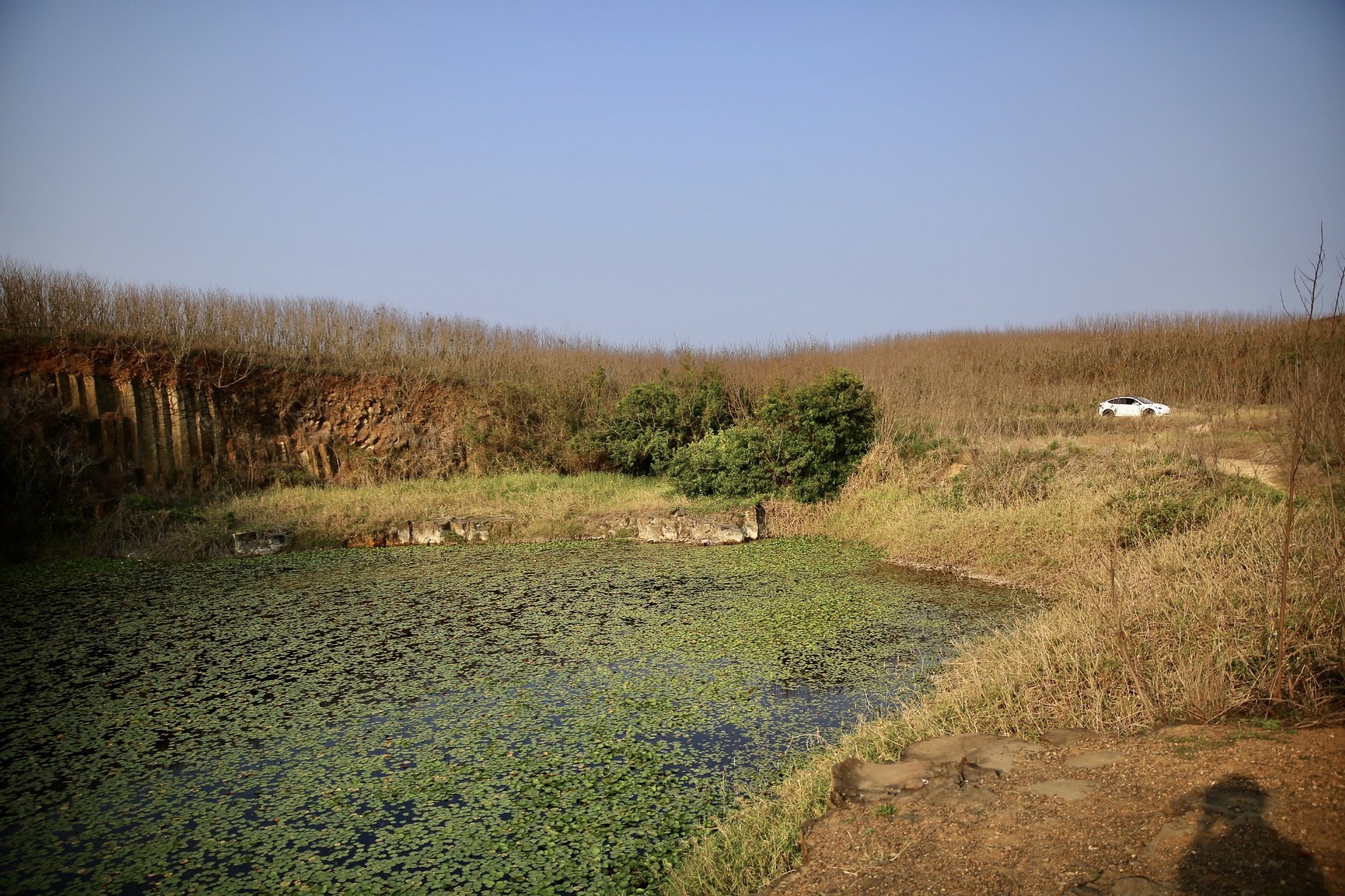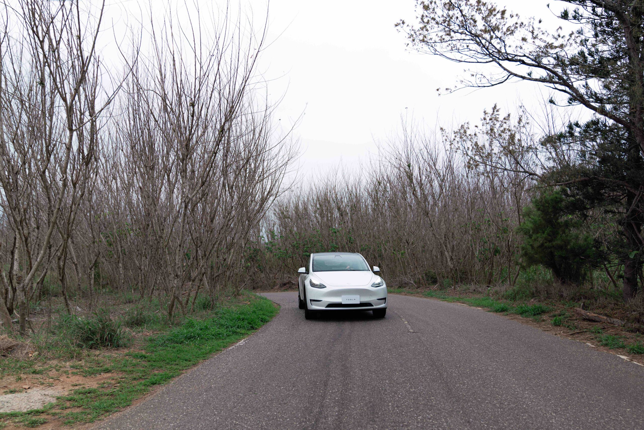 ▲ 停車後,還須穿越一段雜草叢生的防風林,才能抵達三石壁玄武岩秘境,回頭遠眺 Tesla Model Y 頗有置身世外桃源感。